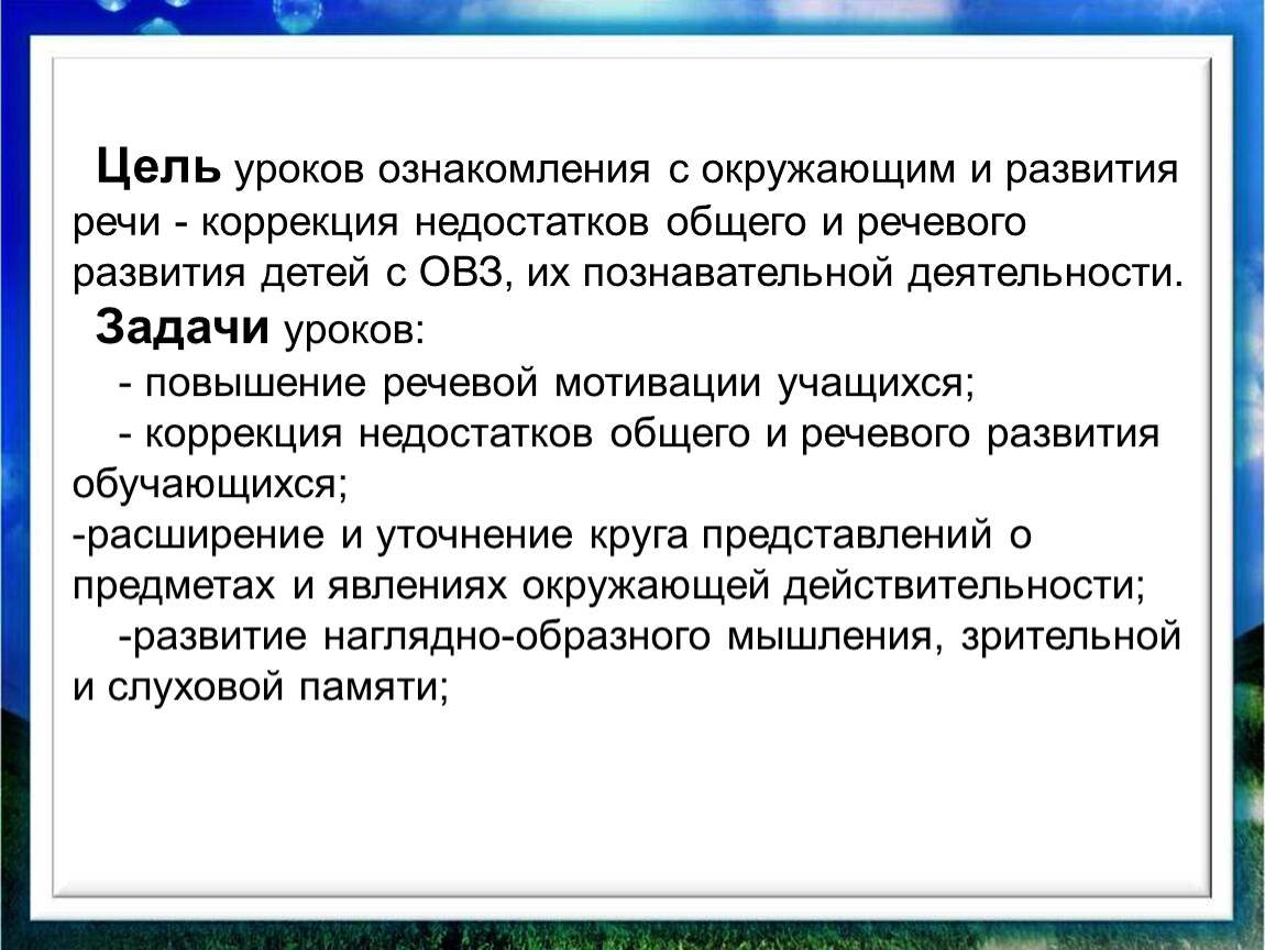 Цель уроков ознакомления с окружающим и развития речи - коррекция недостатков общего и речевого развития детей с ОВЗ, их познавательной деятельности.