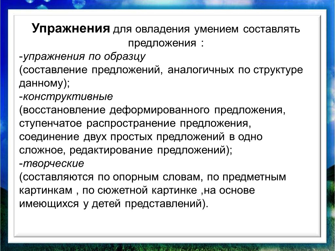 (восстановление деформированного предложения, ступенчатое распространение предложения, соединение двух простых предложений в одно сложное, редактирование предложений);