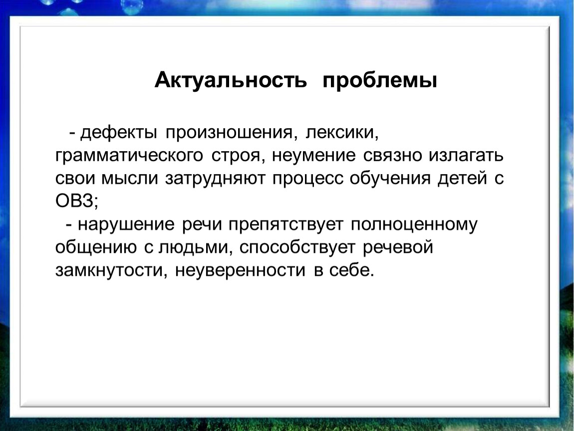 - дефекты произношения, лексики, грамматического строя, неумение связно излагать свои мысли затрудняют процесс обучения детей с ОВЗ;