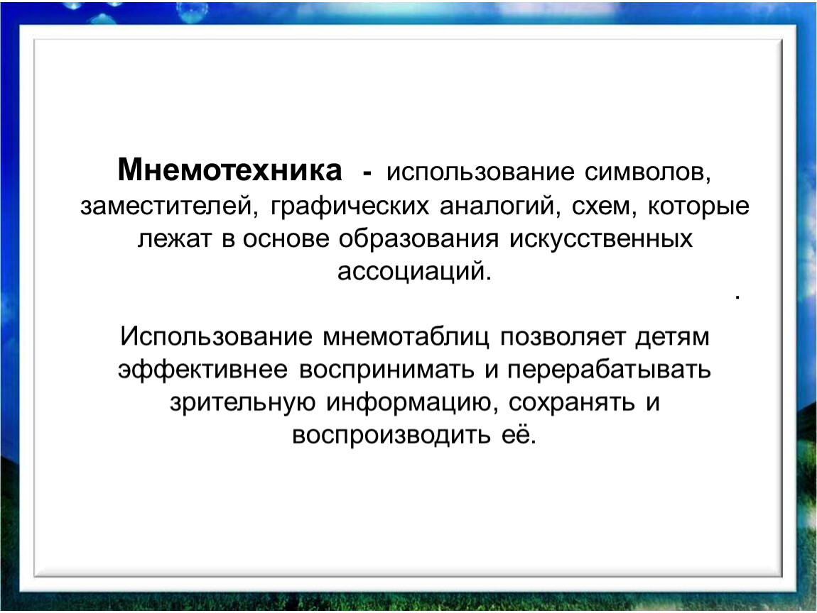 Мнемотехника - использование символов, заместителей, графических аналогий, схем, которые лежат в основе образования искусственных ассоциаций.