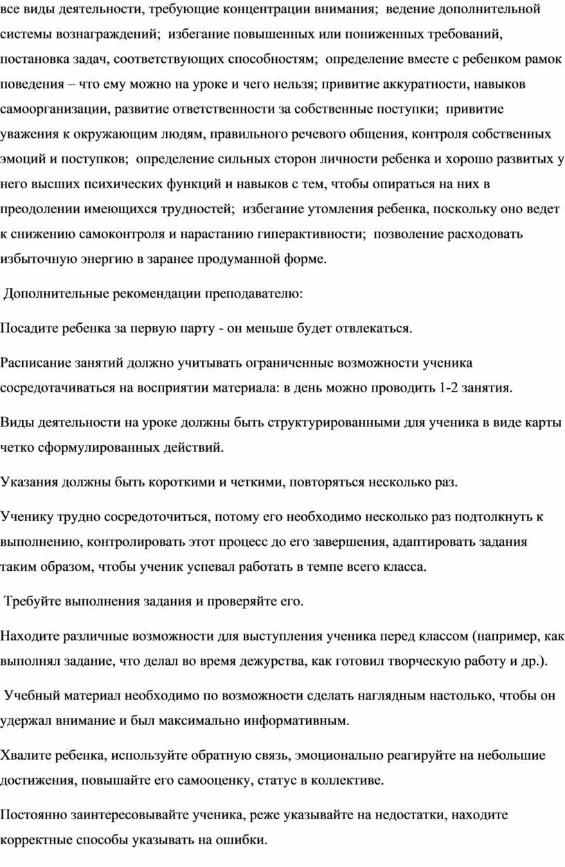 Особые образовательные потребности: позитивная установка в отношениях с ребенком – похвала, подчеркивание успехов; сдержанная, спокойная, доверительная речь, совместное решение возникших трудностей; избегание повторения слова «нет», «нельзя»; поручение всего одного задания на короткий промежуток времени, чтобы ребенок мог его завершить; для подкрепления устных инструкций - зрительная стимуляция; поощрение ребенка за все виды деятельности, требующие концентрации внимания; ведение дополнительной системы вознаграждений; избегание повышенных или пониженных требований, постановка задач, соответствующих способностям; определение вместе с ребенком рамок поведения – что ему можно на уроке и чего нельзя; привитие аккуратности, навыков самоорганизации, развитие ответственности за собственные поступки; привитие уважения к окружающим людям, правильного речевого общения, контроля собственных эмоций и поступков; определение сильных сторон личности ребенка и хорошо развитых у него высших психических функций и навыков с тем, чтобы опираться на них в преодолении имеющихся трудностей; избегание утомления ребенка, поскольку оно ведет к снижению самоконтроля и нарастанию гиперактивности; позволение расходовать избыточную энергию в заранее продуманной форме.