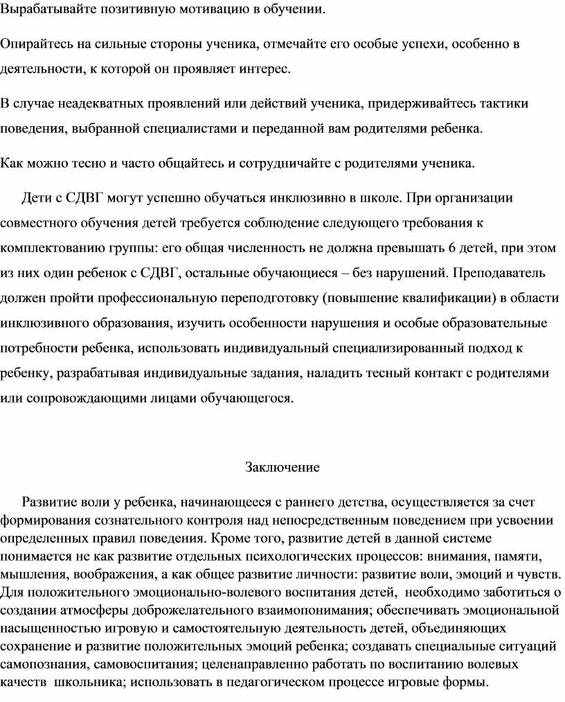 Особые образовательные потребности детей с синдромом гиперактивности с дефицитом внимания (СДВГ) Если коррекционная работа с гиперактивным ребенком проводится настойчиво и последовательно с первых лет его жизни, то можно ожидать, что к 6-7 годам проявления синдрома будут преодолены.