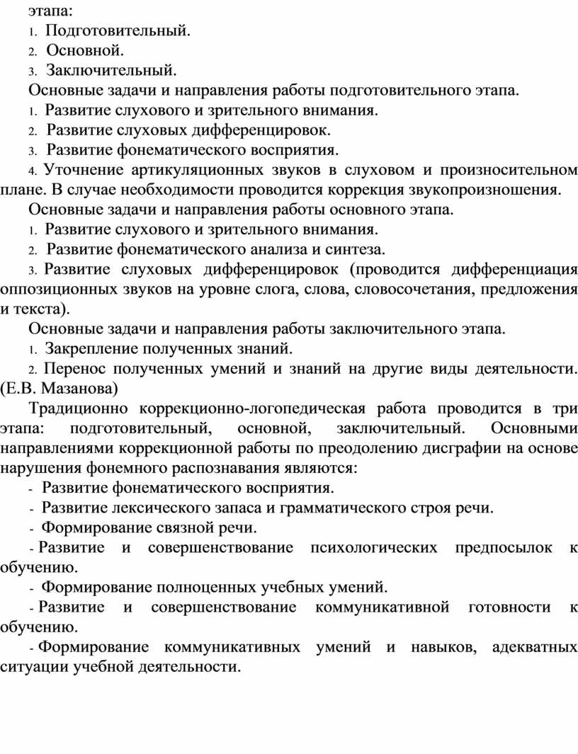 Традиционно коррекционно-логопедическая работа проводится в три этапа: подготовительный, основной, заключительный. Основными направлениями коррекционной работы по преодолению дисграфии на основе нарушения фонемного распознавания являются: