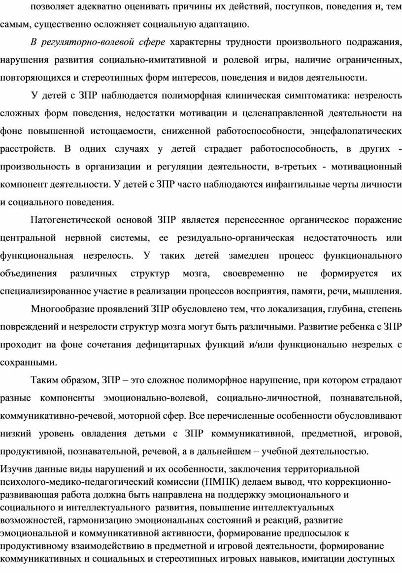 Таким образом, ЗПР – это сложное полиморфное нарушение, при котором страдают разные компоненты эмоционально-волевой, социально-личностной, познавательной, коммуникативно-речевой, моторной сфер. Все перечисленные особенности обусловливают низкий уровень овладения детьми с ЗПР коммуникативной, предметной, игровой, продуктивной, познавательной, речевой, а в дальнейшем – учебной деятельностью.