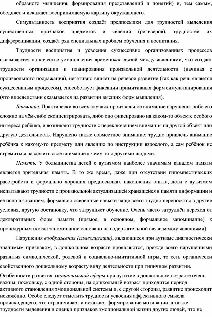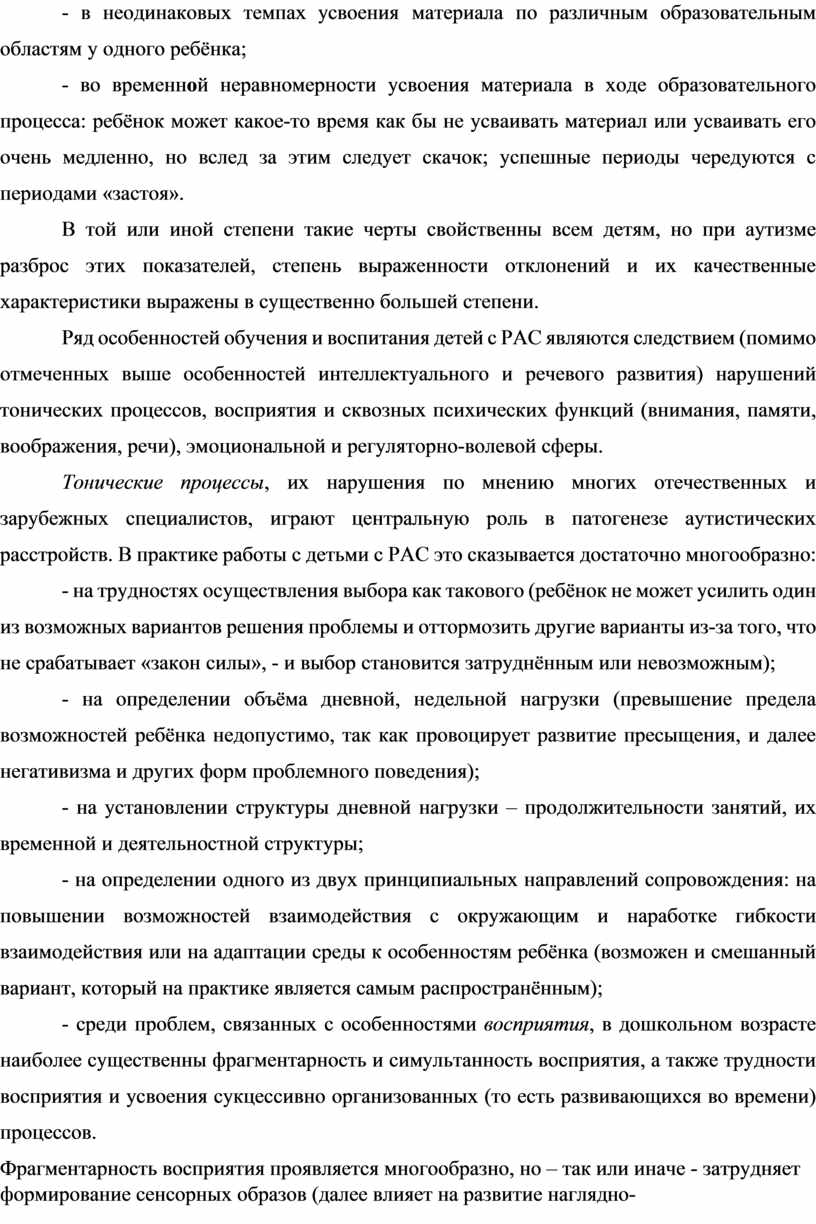 Ряд особенностей обучения и воспитания детей с РАС являются следствием (помимо отмеченных выше особенностей интеллектуального и речевого развития) нарушений тонических процессов, восприятия и сквозных психических функций (внимания, памяти, воображения, речи), эмоциональной и регуляторно-волевой сферы.