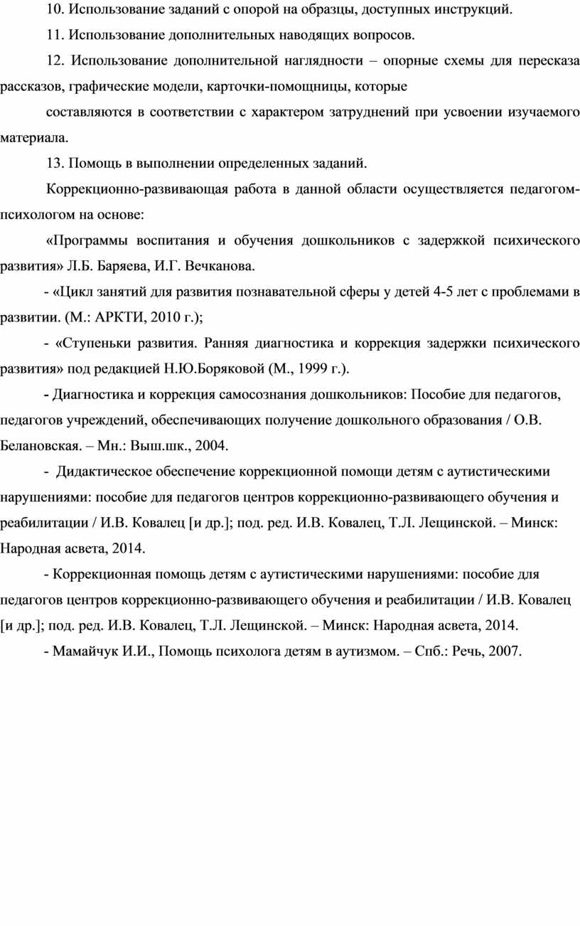 1. «Программы воспитания и обучения дошкольников с задержкой психического развития» Л.Б. Баряева, И.Г. Вечканова. 2. «Цикл занятий для развития познавательной сферы у детей 4-5 лет с проблемами в развитии. (М.: АРКТИ, 2010 г.); 3. - «Ступеньки развития. Ранняя диагностика и коррекция задержки психического развития» под редакцией Н.Ю.Боряковой (М., 1999 г.). 4. Диагностика и коррекция самосознания дошкольников: Пособие для педагогов, педагогов учреждений, обеспечивающих получение дошкольного образования / О.В. Белановская. – Мн.: Выш.шк., 2004. 5. Дидактическое обеспечение коррекционной помощи детям с аутистическими нарушениями: пособие для педагогов центров коррекционно-развивающего обучения и реабилитации / И.В. Ковалец [и др.]; под. ред. И.В. Ковалец, Т.Л. Лещинской. – Минск: Народная асвета, 2014. 6. Коррекционная помощь детям с аутистическими нарушениями: пособие для педагогов центров коррекционно-развивающего обучения и реабилитации / И.В. Ковалец [и др.]; под. ред. И.В. Ковалец, Т.Л. Лещинской. – Минск: Народная асвета, 2014. 7. Мамайчук И.И., Помощь психолога детям в аутизмом. – Спб.: Речь, 2007. 8. Дидактические игры и пособия («Пазлы», «Геометрическая мозаика», «Тактильное лото», «Тактильные кубики», доска «Сегена», кукла, фигурки животных, каски и т.д.) |