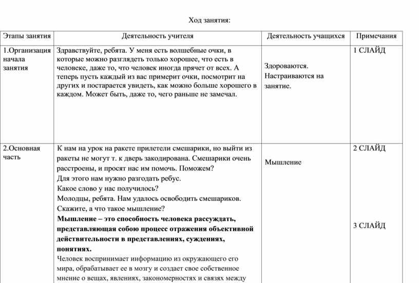 К нам на урок на ракете прилетели смешарики, но выйти из ракеты не могут т. к дверь закодирована. Смешарики очень расстроены, и просят нас им помочь. Поможем? Для этого нам нужно разгодать ребус. Какое слово у нас получилось? Молодцы, ребята. Нам удалось освободить смешариков. Скажите, а что такое мышление? Мышление – это способность человека рассуждать, представляющая собою процесс отражения объективной действительности в представлениях, суждениях, понятиях. Человек воспринимает информацию из окружающего его мира, обрабатывает ее в мозгу и создает свое собственное мнение о вещах, явлениях, закономерностях и связях между ними. Если просто ощущение и восприятие свойственно всем живым существам, то мышление есть только у человека. Выделяются следующие виды мышления: - Теоретическое мышление – мышление, направленное на познание внутреннего содержания и сущности сложных системных объектов. - Эмпирическое мышление – мышление, направленное на познание внешних проявлений рассматриваемых предметов и явлений. - Критическое мышление направлено на выявление недостатков в суждениях других людей. - Творческое мышление связано с открытием принципиально нового знания, с генерацией собственных оригинальных идей, а не с оцениванием чужих мыслей. Как вы думаете, может ли человек развивать свое мышление? Что нужнодля этого делать? Этим мы и будем заниматься на занятии. Итак, ребята, Нюша предлагает нам первое задание. Вам нужно будет разделиться на группы. Каждой группе нужно выполнить математическое действие и прочитать слово: ЛОД+ИМ-МО+ВАН-Л=? (ДИВАН) ВЕР+ЛИС+ТУ-УС+О-ИЛ+ЛЕТ=? (ВЕРТОЛЕТ) БИТ+РА-БИР+ОР+ВЕ-ОВ+ЛУК+А-У=? (ТАРЕЛКА) ЛЯ+РОТ-ЛОТ+УМ+КАР-УК+КО+АЗ-ОЗ=? (ЯРМАРКА) Молодцы. Что мы развивали, выполняя данное задание? Возникли ли сложности? В чем? Нюша осталась довольна. Крош просит нашей помощи. Сейчас вам нужно быстро закончить предложения. • Лимоны кислые, а сахар … • Собака лает, а кошка … • Ночью темно, а днём … • Трава зелёная, а небо … • Утром мы завтракаем, а днём … • Птица летает, а змея … • Зимой холодно, а летом … • Ты смотришь глазами, а дышишь … • Из шерсти вяжут, а из ткани… • Дрова пилят, а гвозди … Молодцы. Что мы тренировали, выполняя данное упражнение? физминтука Встаньте прямо. Поднимите руки вверх. Потянитесь. Представьте, что ваши руки – это стебельки с распустившимися на них цветами. Лепестки цветов тянутся вверх к солнышку. Глубоко вдохните. Закиньте сомкнутые руки за голову. Затем разъедините их и вытяните вверх. Дышите глубоко и ровно. Представьте, что хотите дотянуться руками до неба. Плавно опустите руки. Крош приготовил для нас еще одно задание. Вам нужно составить из двух слов – одно существительное, все буквы должны быть использованы. парк – ива = крапива боб – уста = суббота ров – поза = паровоз кожа – ворон = жаворонок Молодцы. Что мы развивали, выполняя это упражнение? Посмотрите на экран. Знаете ли вы, кто это? Совунья предлагает нам решить задачу. У Копатыча было 5 целых яблок, 6 половинок, да 8 четвертинок. Сколько всего яблок было у Копатыча? Ответ: 10 Какой ответ получили? Как вы решили? У кого получился другой ответ? Молодцы. Возникли ли сложности в решении задачи? Что мы развивали с помощью выполнения этого задания? Посмотрите, что какое задание нам приготовил Ёжик. Найди среди пяти слов, написанных под чертой одно, которое