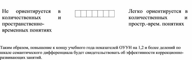 Таким образом, повышение к концу учебного года показателей ОУУН на 1,2 и более делений по шкале семантического дифференциала будет свидетельствовать об эффективности коррекционно-развивающих занятий.
