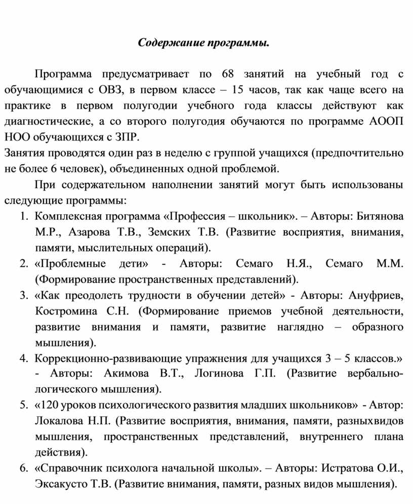 Программа предусматривает по 68 занятий на учебный год с обучающимися с ОВЗ, в первом классе – 15 часов, так как чаще всего на практике в первом полугодии учебного года классы действуют как диагностические, а со второго полугодия обучаются по программе АООП НОО обучающихся с ЗПР.