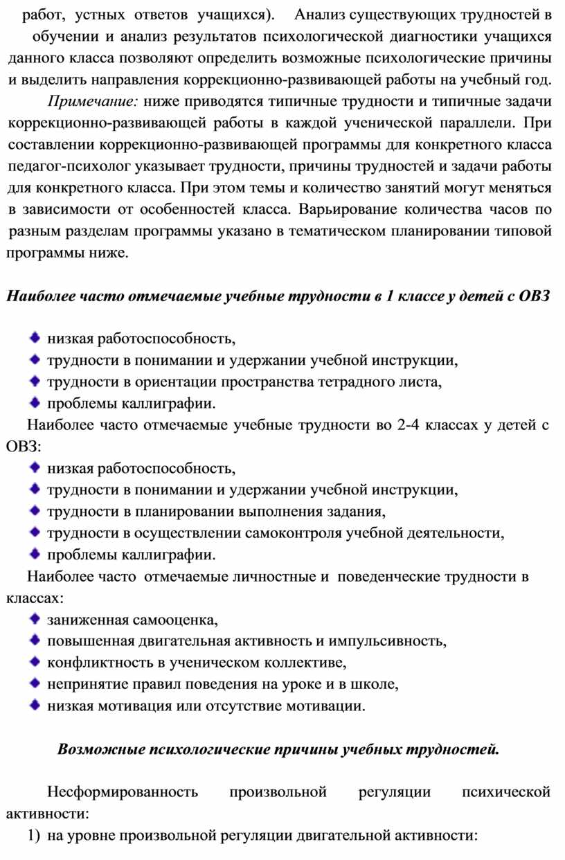 работ, устных ответов учащихся). Анализ существующих трудностей в обучении и анализ результатов психологической диагностики учащихся данного класса позволяют определить возможные психологические причины и выделить направления коррекционно-развивающей работы на учебный год. Примечание: ниже приводятся типичные трудности и типичные задачи коррекционно-развивающей работы в каждой ученической параллели. При составлении коррекционно-развивающей программы для конкретного класса педагог-психолог указывает трудности, причины трудностей и задачи работы для конкретного класса. При этом темы и количество занятий могут меняться в зависимости от особенностей класса. Варьирование количества часов по разным разделам программы указано в тематическом планировании типовой