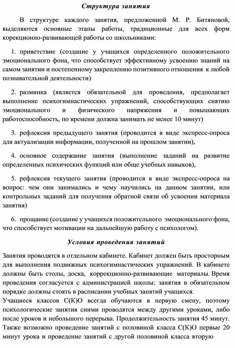 В структуре каждого занятия, предложенной М. Р. Битяновой, выделяются основные этапы работы, традиционные для всех форм корекционно-развивающей работы со школьниками: