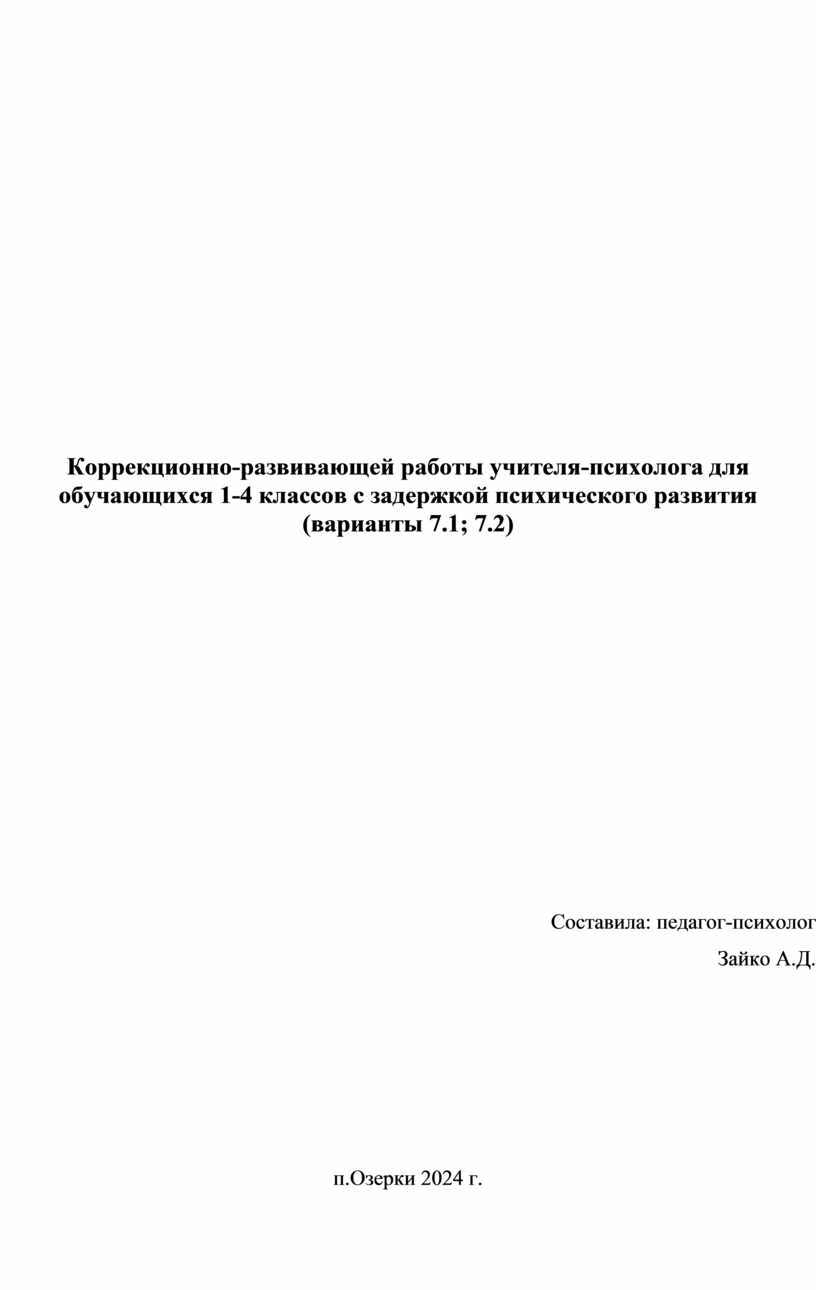 Коррекционно-развивающей работы учителя-психолога для обучающихся 1-4 классов с задержкой психического развития (варианты 7.1; 7.2)