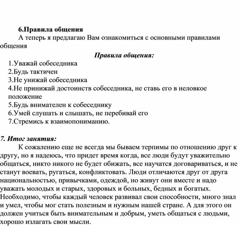 Правила общения: 1.Уважай собеседника 2.Будь тактичен 3.Не унижай собеседника 4.Не принижай достоинств собеседника, не ставь его в неловкое положение 5.Будь внимателен к собеседнику 6.Умей слушать и слышать, не перебивай его 7.Стремись к взаимопониманию. |
