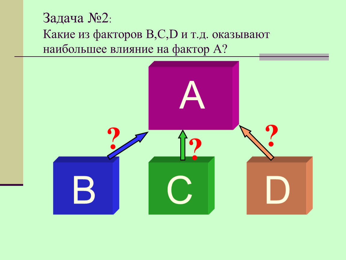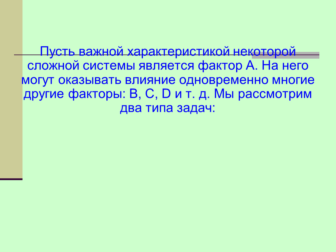 Пусть важной характеристикой некоторой сложной системы является фактор А. На него могут оказывать влияние одновременно многие другие факторы: В, С, D и т. д. Мы рассмотрим два типа задач: