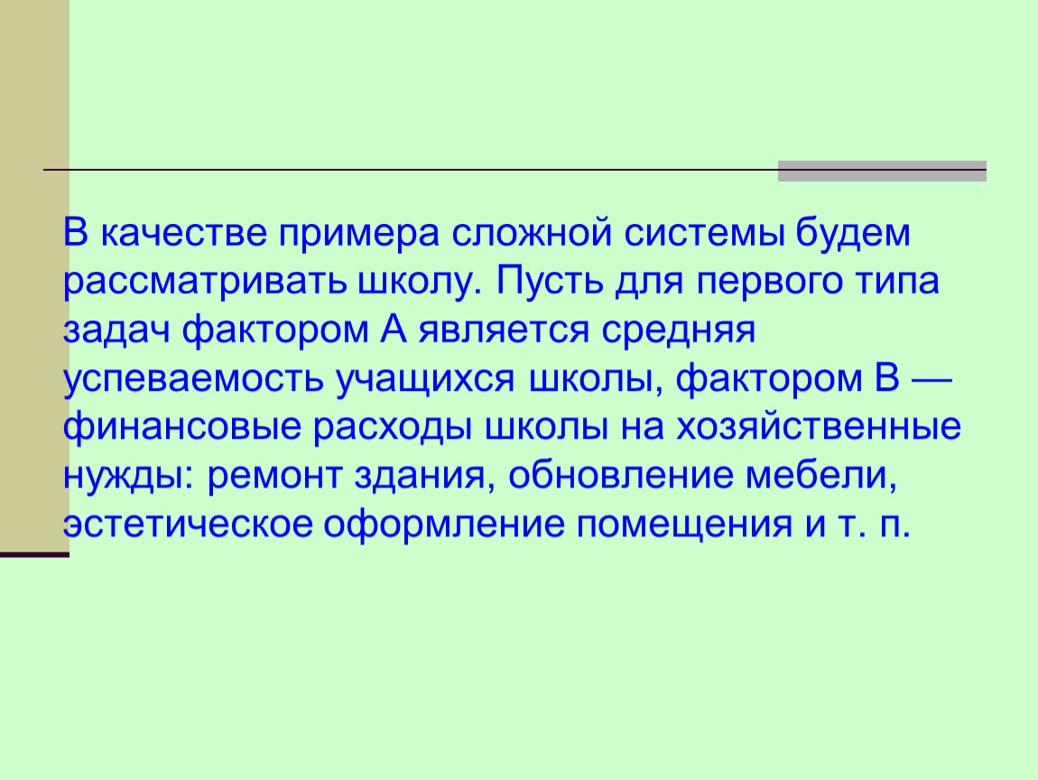 В качестве примера сложной системы будем рассматривать школу. Пусть для первого типа задач фактором А является средняя успеваемость учащихся школы, фактором В — финансовые расходы школы на хозяйственные нужды: ремонт здания, обновление мебели, эстетическое оформление помещения и т. п.