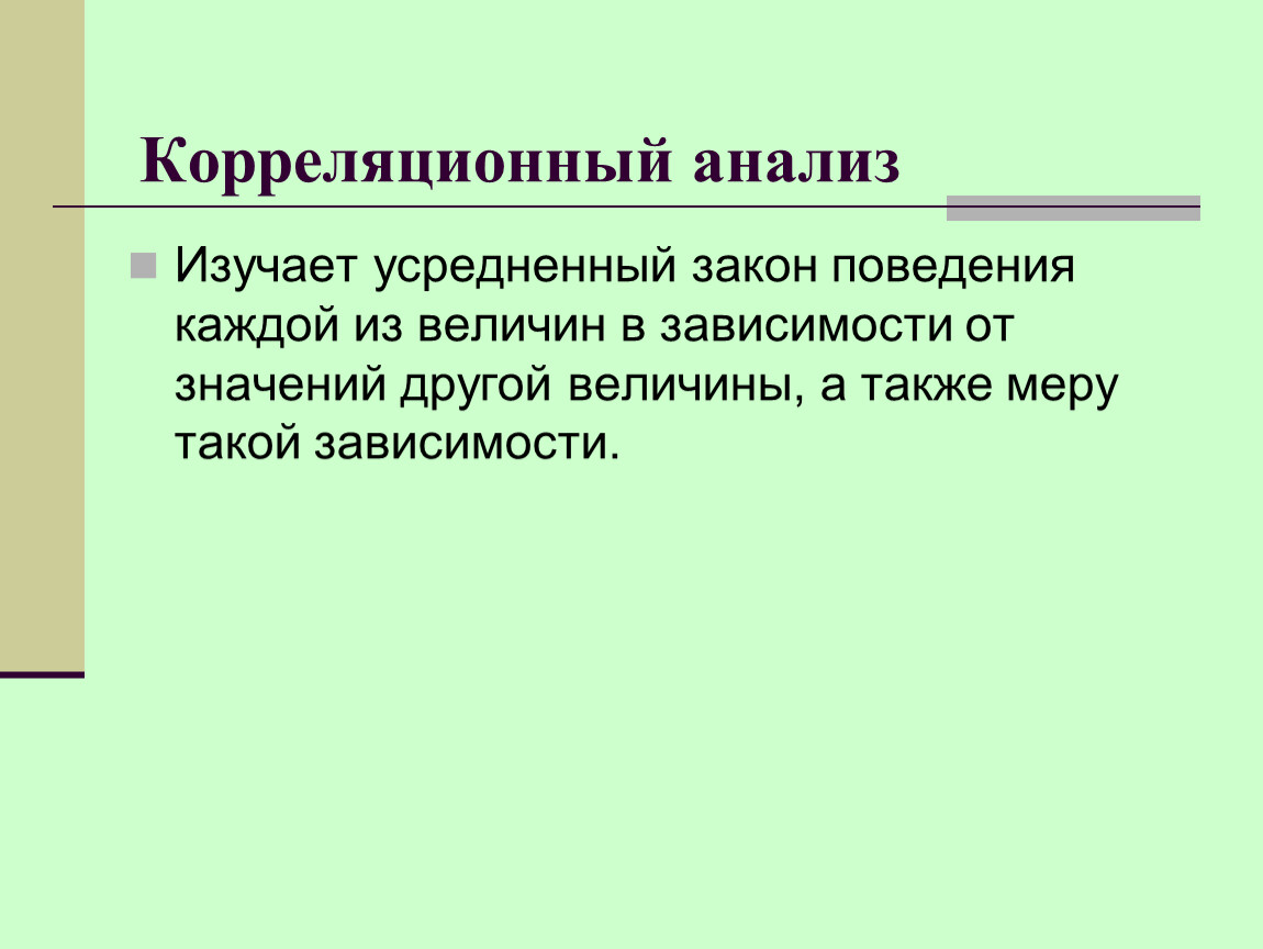 Изучает усредненный закон поведения каждой из величин в зависимости от значений другой величины, а также меру такой зависимости.