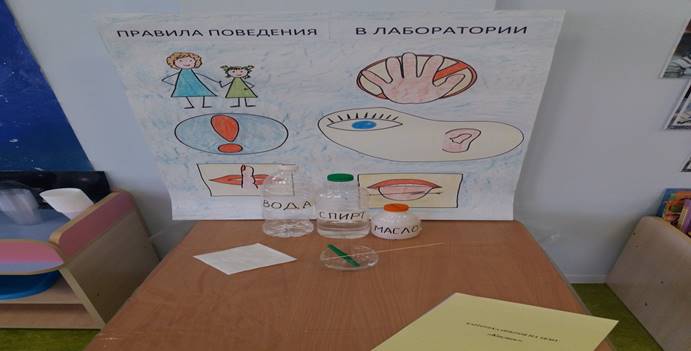 Перед тем как начать наши опыты, надо пройти инструктаж по технике безопасности. (Учитель проводит инструктаж и знакомит с правилами поведения в лаборатории). На демонстрационном плакате изображены знаки предупреждения, понятные для каждого, обозначающие правила: «Опыты делать только со взрослыми», «Слушать внимательно», «Соблюдать последовательность», «Не шуметь, на вкус не пробовать».