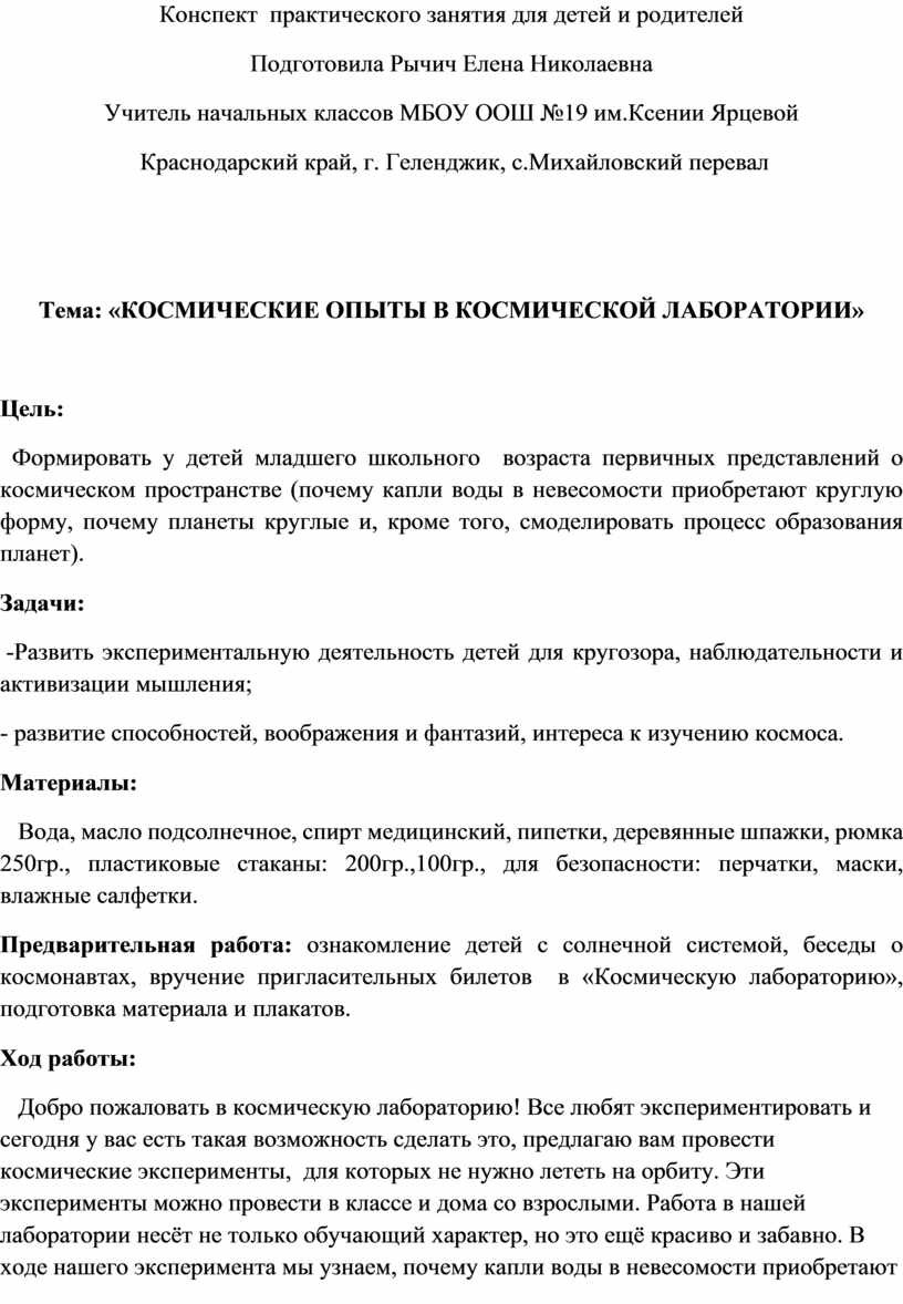 Конспект практического занятия для детей и родителей