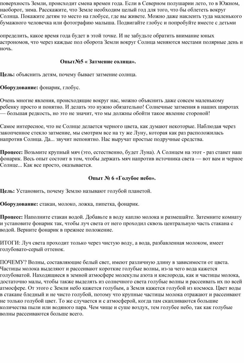 Процесс: Лучше всего сделать это на модели Солнечной системы! . Для нее понадобятся всего-то две вещи — глобус и обычный фонарик. Включите в затемненной групповой комнате фонарик и направьте на глобус примерно на ваш город. Объясните детям: “Смотри; фонарик — это Солнце, оно светит на Землю. Там, где светло, уже наступил день. Вот, еще немножко повернем — теперь оно как раз светит на наш город. Там, куда лучи Солнца не доходят, — у нас ночь. Спросите у детей, как они думают, что происходит там, где граница света и темноты размыта. Уверен, любой малыш догадается, что это утро либо вечер