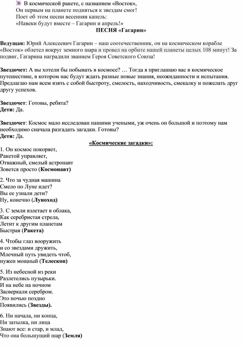 Ведущая: Юрий Алексеевич Гагарин – наш соотечественник, он на космическом корабле «Восток» облетел вокруг земного шара и провел на орбите нашей планеты целых 108 минут! За подвиг, Гагарина наградили званием Героя Советского Союза!