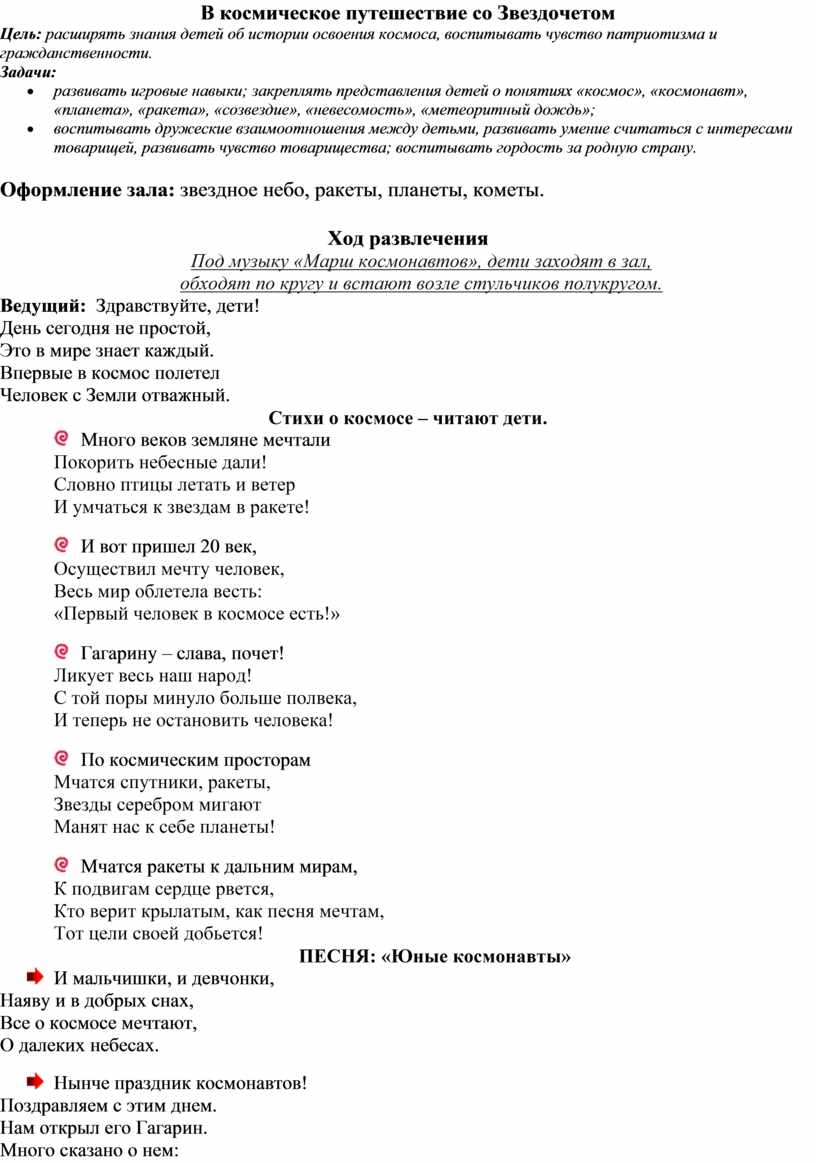 Звездочет: А вы хотели бы побывать в космосе? … Тогда я приглашаю вас в космическое путешествие, в котором нас будут ждать разные новые знания, неожиданности и испытания. Предлагаю нам всем взять с собой быстроту, смелость, находчивость, смекалку и пожелать друг другу успехов.