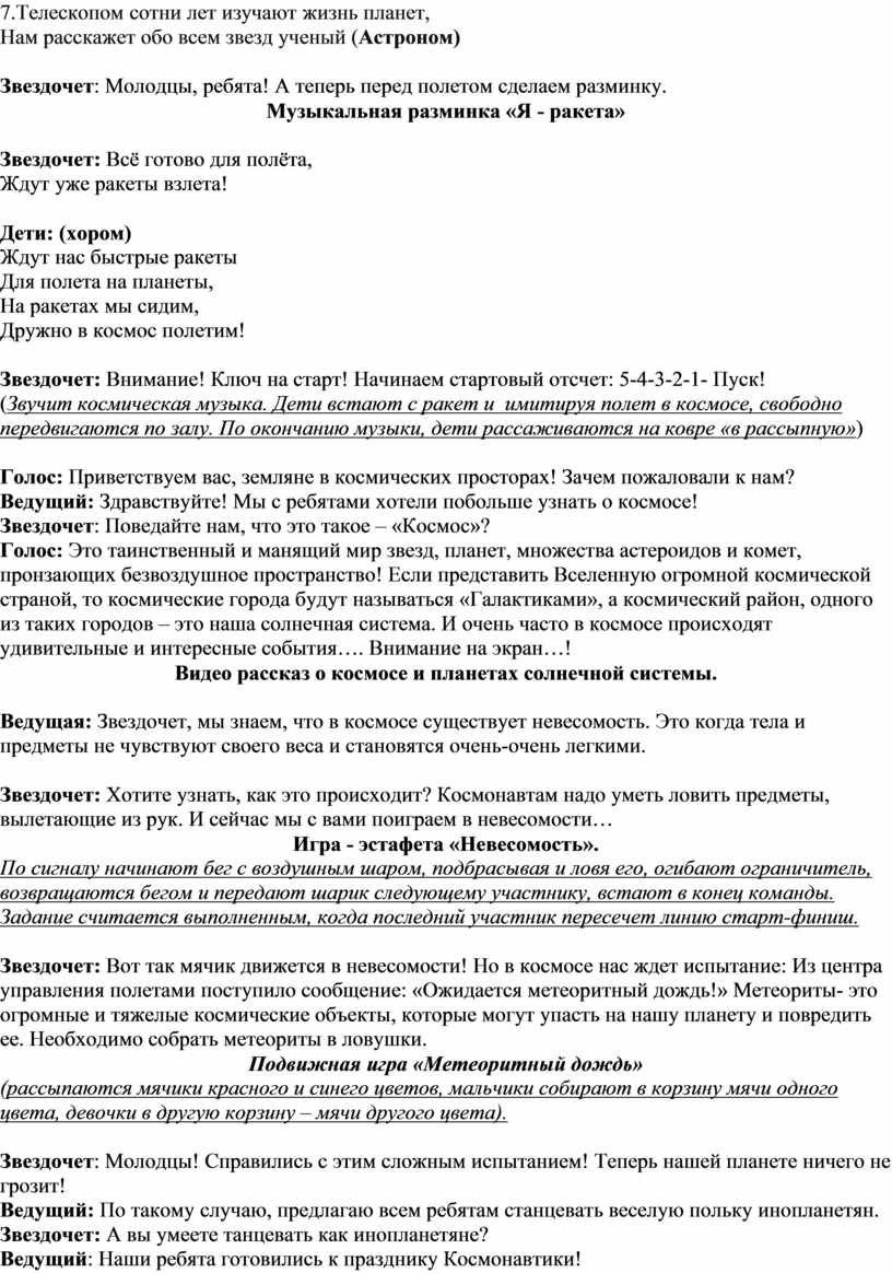 Звездочет: Здравствуйте, ребята! Я - Звездочет, пришел к вам в гости. Я очень люблю наблюдать за звездами. Вы знаете, кокой сегодня день? Да, сегодня у нас необычный праздник - День космонавтики!