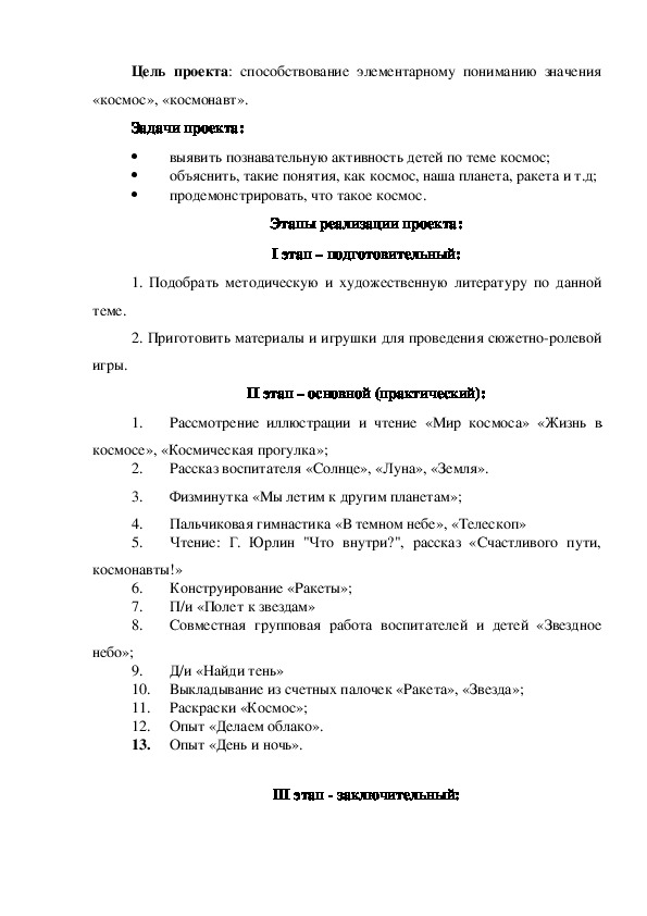 детской деятельности.Цель проекта: способствование элементарному пониманию значения