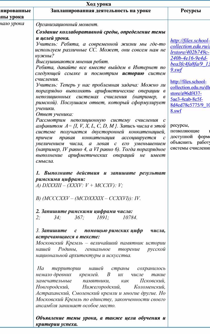 Организационный момент. Создание коллаборативной среды, определение темы и целей урока. Учитель: Ребята, а современной жизни мы где-то используем различные СС. Может, они совсем нам не нужны? Выслушиваются мнения ребят. Ребята, давайте все вместе выйдем в Интернет по следующей ссылке и посмотрим историю систем счисления. Учитель: Теперь у нас проблемная задача: Можно ли поразрядно выполнять арифметические операции в непозиционных системах счисления (например, в римской). Послушаем ответ, который сформулирует ученики. Ответ ученика: Рассмотрим непозиционную систему счисления с алфавитом А= {I, V, X, L, C, D, M }. Запись числа в этой системе получается двусторонней конкатенацией, причем правая конкатенация ассоциируется с увеличением числа, а левая с его уменьшением (например, IV равно 4, а VI равно 6). Тогда поразрядное выполнение арифметических операций не имеет смысла.