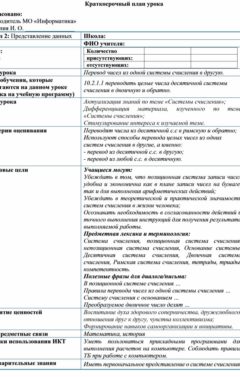 Учащиеся могут: Убеждать в том, что позиционная система записи чисел удобна и экономична как в плане записи чисел на бумаге, так и для выполнения арифметических действий; Убеждать в теоретической и практической значимости систем счисления в жизни человека; Осознавать необходимость в согласованности действий и точного выполнения инструкций для получения результата выполняемой работы. Предметная лексика и терминология: Система счисления, позиционная система счисления, непозиционная система счисления, Основание системы, Десятичная система счисления, Двоичная система счисления, Римская система счисления, тетрады, триады, компетентность. Полезные фразы для диалога/письма: В позиционной системе счисления … Правила перевода чисел из одной системы счисления … Систему счисления с основанием … Преобразуемое двоичное число делят … |