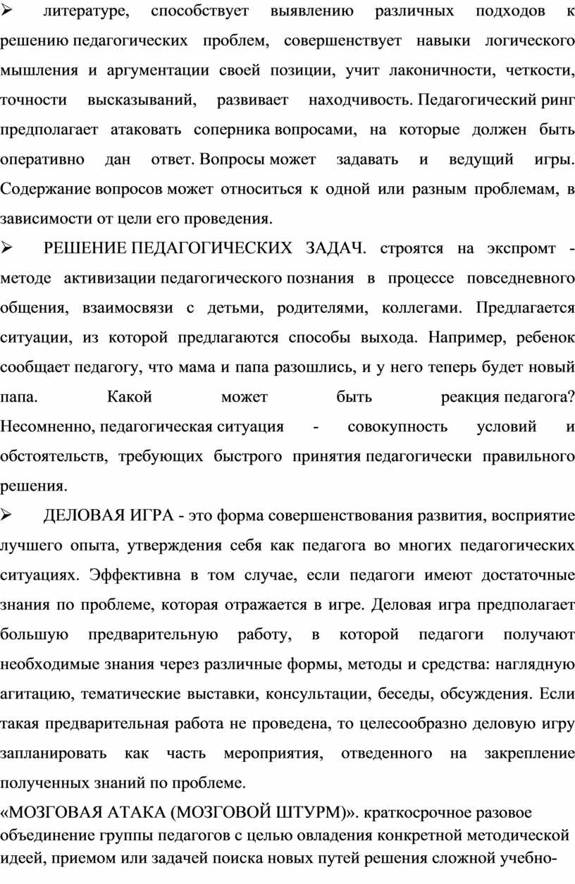 Ø «МОЗГОВАЯ АТАКА (МОЗГОВОЙ ШТУРМ)». краткосрочное разовое объединение группы педагогов с целью овладения конкретной методической идеей, приемом или задачей поиска новых путей решения сложной учебно-методической проблемы. Группа из нескольких человек активно обсуждает и решает проблему; лидер группы озвучивает общее решение.