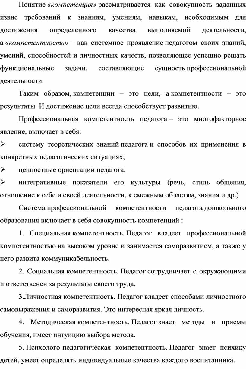 Понятие «компетенция» рассматривается как совокупность заданных извне требований к знаниям, умениям, навыкам, необходимым для достижения определенного качества выполняемой деятельности, а «компетентность» – как системное проявление педагогом своих знаний, умений, способностей и личностных качеств, позволяющее успешно решать функциональные задачи, составляющие сущность профессиональной деятельности.