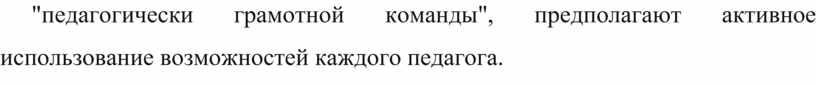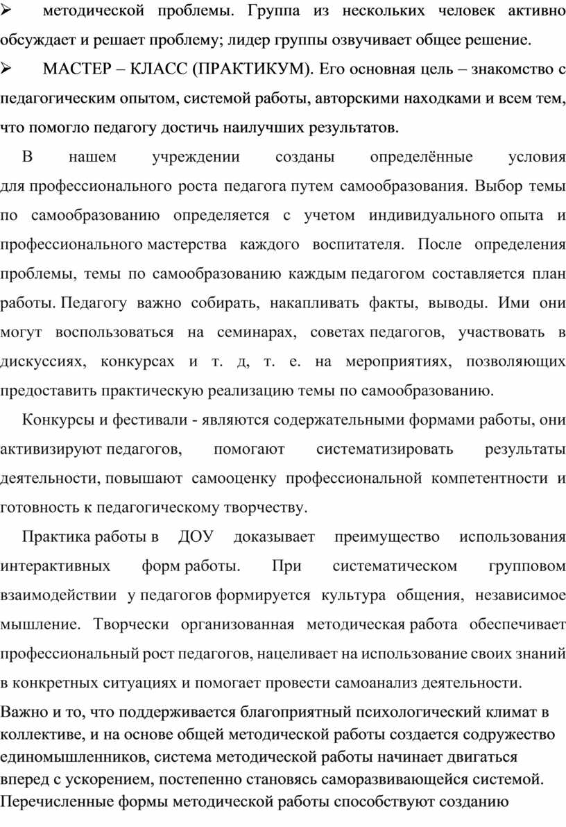 Важно и то, что поддерживается благоприятный психологический климат в коллективе, и на основе общей методической работы создается содружество единомышленников, система методической работы начинает двигаться вперед с ускорением, постепенно становясь саморазвивающейся системой. Перечисленные формы методической работы способствуют созданию "педагогически грамотной команды", предполагают активное использование возможностей каждого педагога.