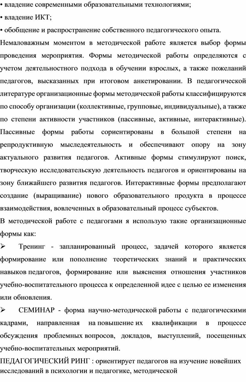 Немаловажным моментом в методической работе является выбор формы проведения мероприятия. Формы методической работы определяются с учетом деятельностного подхода в обучении взрослых, а также пожеланий педагогов, высказанных при итоговом анкетировании. В педагогической литературе организационные формы методической работы классифицируются по способу организации (коллективные, групповые, индивидуальные), а также по степени активности участников (пассивные, активные, интерактивные). Пассивные формы работы сориентированы в большой степени на репродуктивную мыследеятельность и обеспечивают опору на зону актуального развития педагогов. Активные формы стимулируют поиск, творческую исследовательскую деятельность педагогов и ориентированы на зону ближайшего развития педагогов. Интерактивные формы предполагают создание (выращивание) нового образовательного продукта в процессе взаимодействия, вовлеченных в образовательный процесс субъектов.