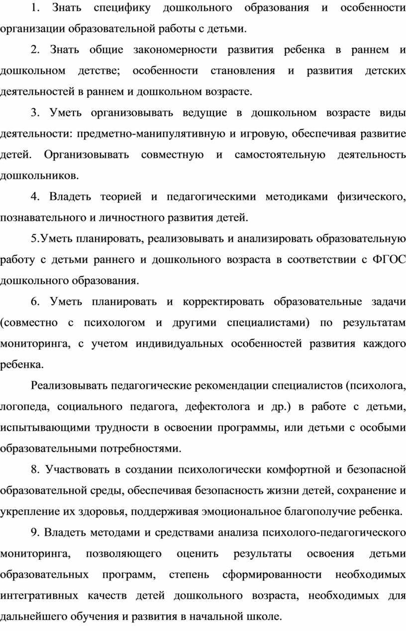 1. Знать специфику дошкольного образования и особенности организации образовательной работы с детьми.