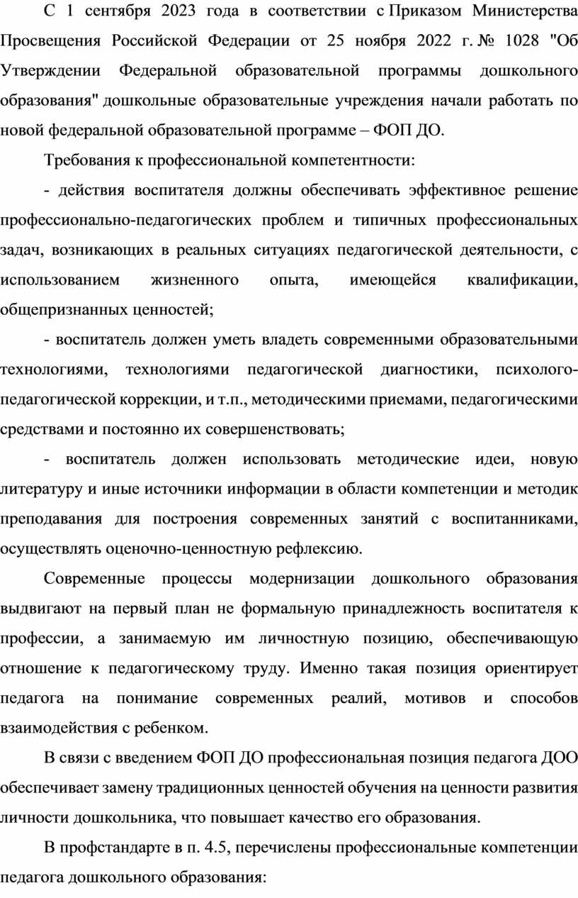 С 1 сентября 2023 года в соответствии с Приказом Министерства Просвещения Российской Федерации от 25 ноября 2022 г. № 1028 "Об Утверждении Федеральной образовательной программы дошкольного образования" дошкольные образовательные учреждения начали работать по новой федеральной образовательной программе – ФОП ДО.