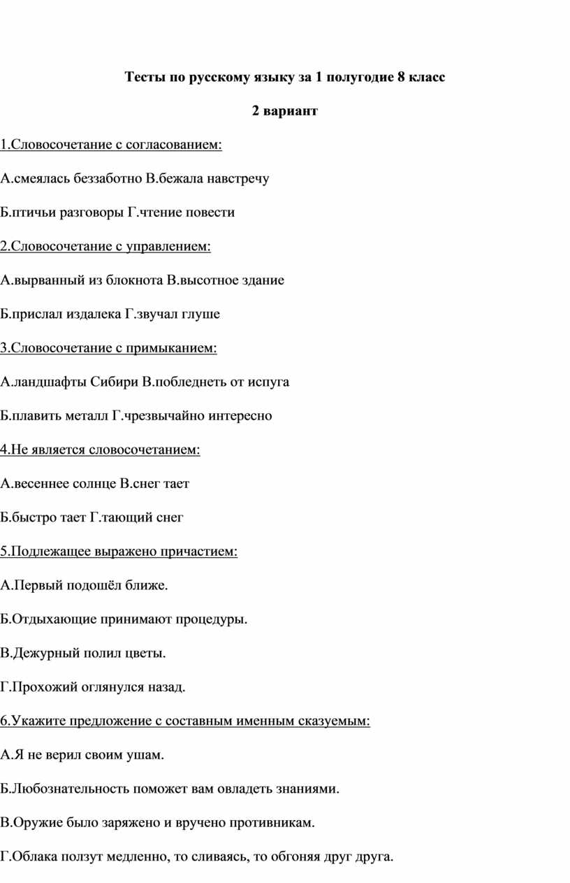 Тесты по русскому языку за 1 полугодие 8 класс