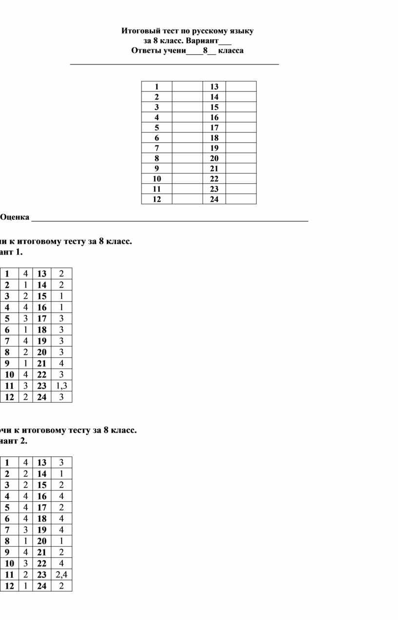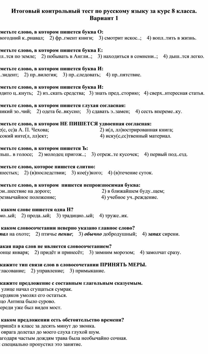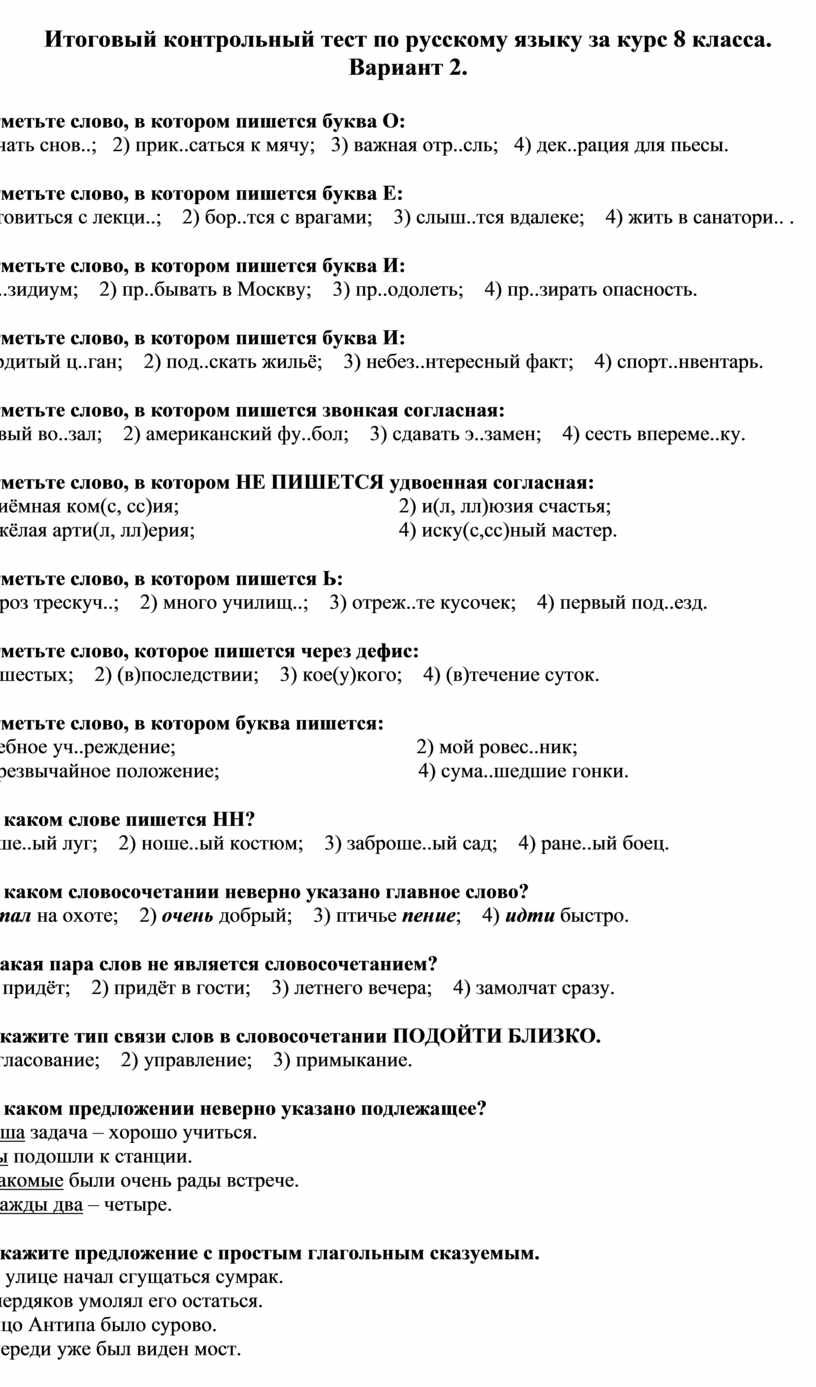 Итоговый контрольный тест по русскому языку за курс 8 класса.