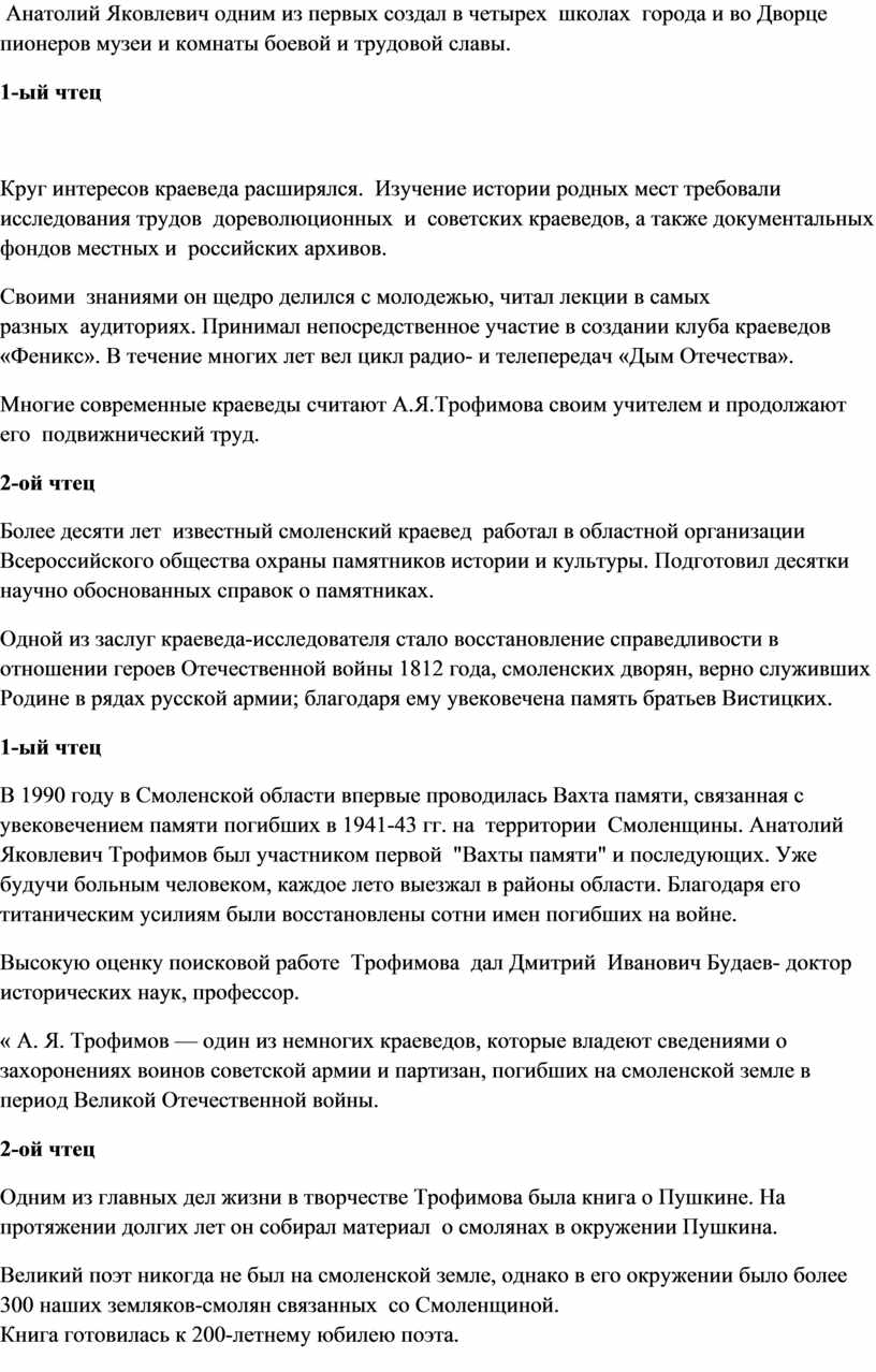 « А. Я. Трофимов — один из немногих краеведов, которые владеют сведениями о захоронениях воинов советской армии и партизан, погибших на смоленской земле в период Великой Отечественной войны.