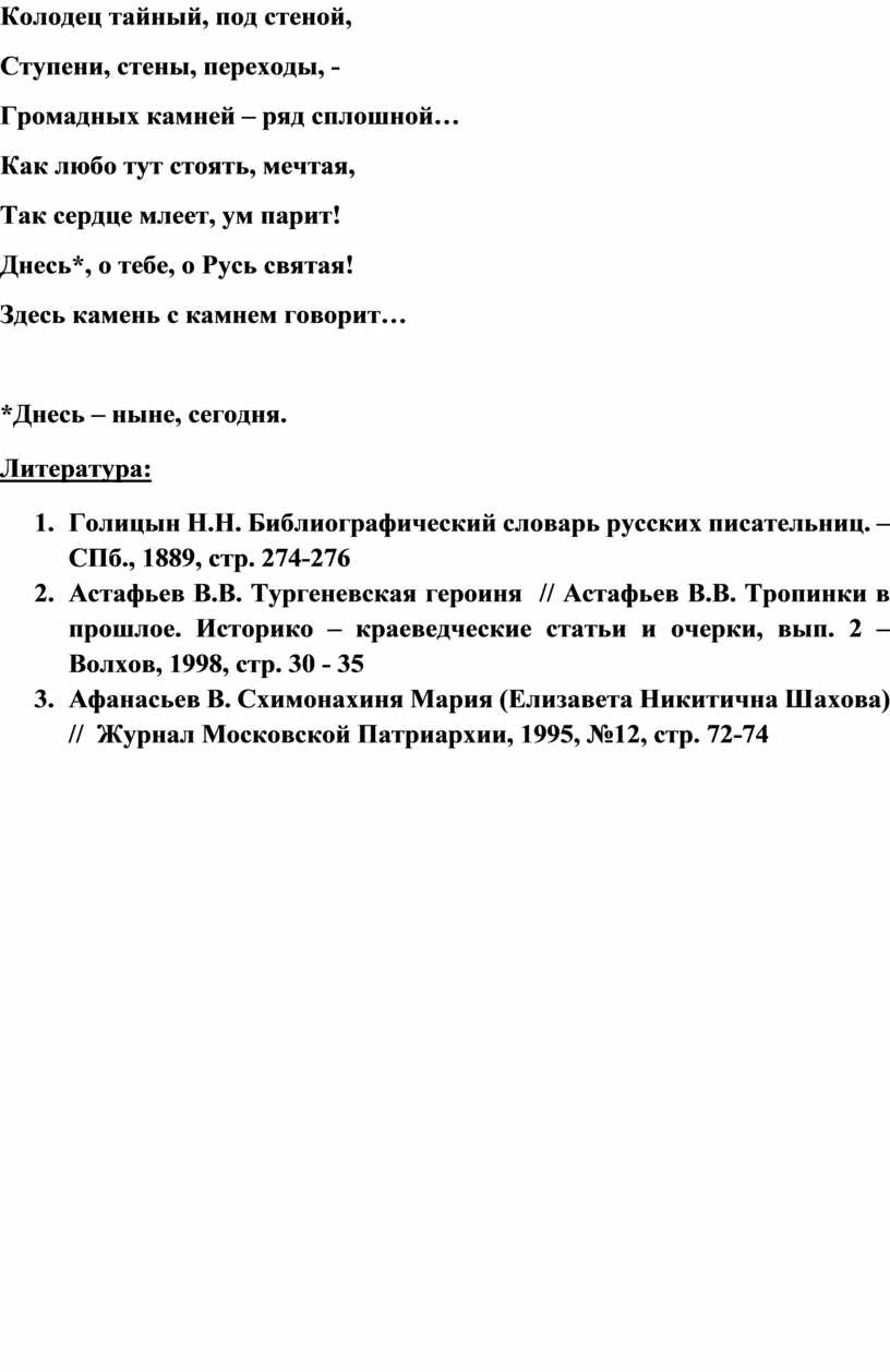 2. Астафьев В.В. Тургеневская героиня // Астафьев В.В. Тропинки в прошлое. Историко – краеведческие статьи и очерки, вып. 2 – Волхов, 1998, стр. 30 - 35