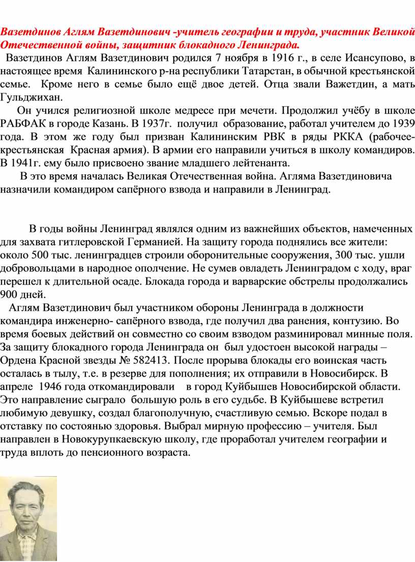 Вазетдинов Аглям Вазетдинович -учитель географии и труда, участник Великой Отечественной войны, защитник блокадного Ленинграда.
