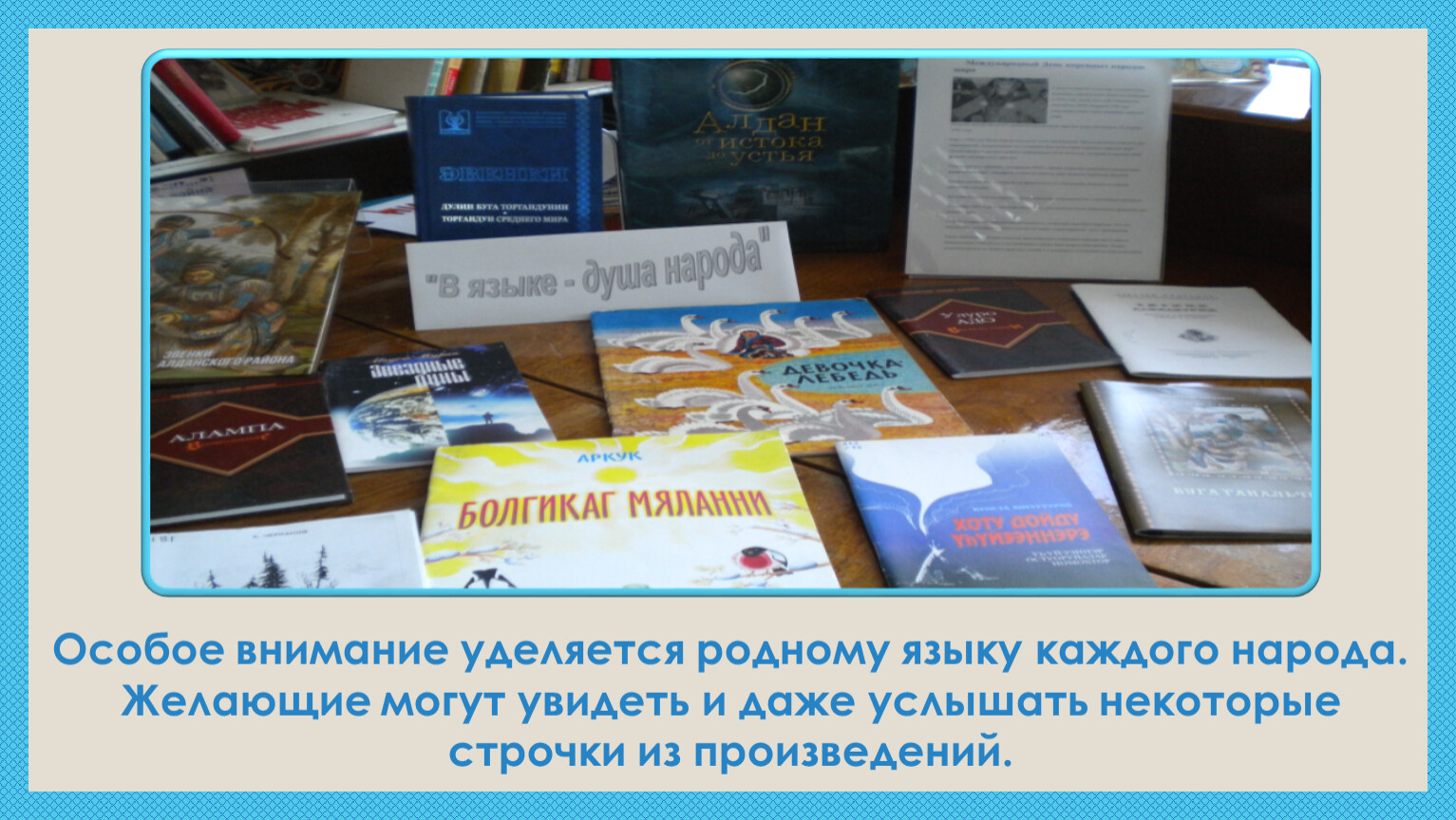 Особое внимание уделяется родному языку каждого народа. Желающие могут увидеть и даже услышать некоторые строчки из произведений.