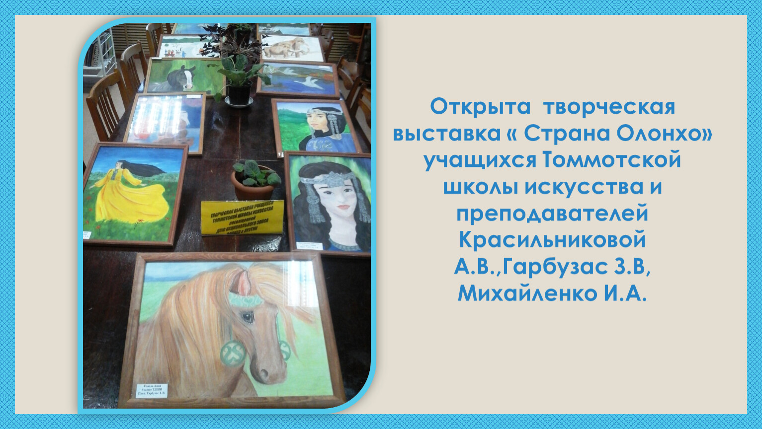 Открыта творческая выставка « Страна Олонхо» учащихся Томмотской школы искусства и преподавателей Красильниковой А.В.,Гарбузас З.В, Михайленко И.А.