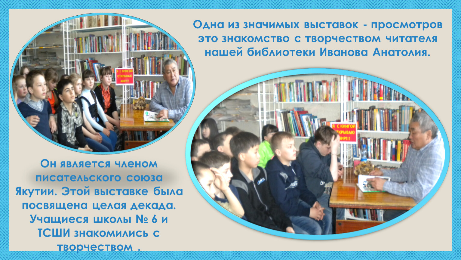Он является членом писательского союза Якутии. Этой выставке была посвящена целая декада. Учащиеся школы № 6 и ТСШИ знакомились с творчеством .