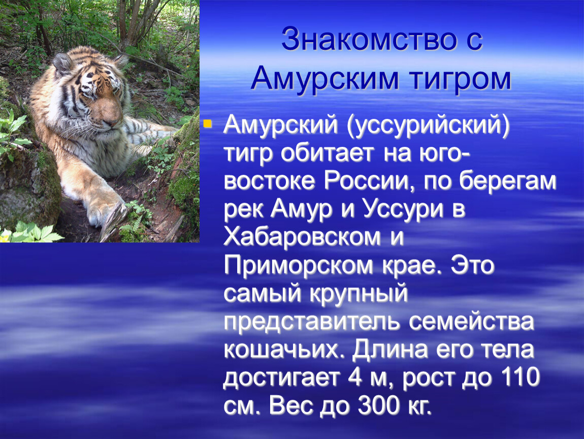 Амурский (уссурийский) тигр обитает на юго-востоке России, по берегам рек Амур и Уссури в Хабаровском и Приморском крае. Это самый крупный представитель семейства кошачьих. Длина его тела достигает 4 м, рост до 110 см. Вес до 300 кг.