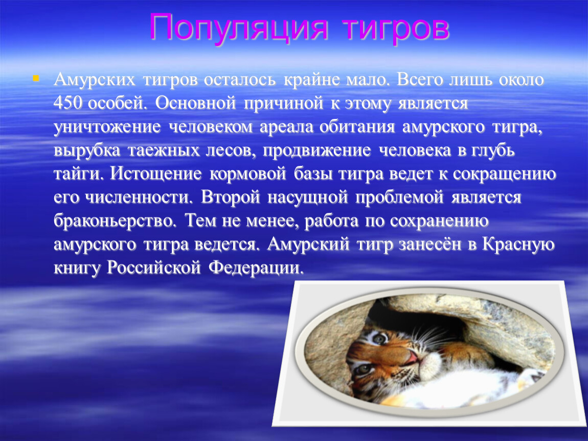 Амурских тигров осталось крайне мало. Всего лишь около 450 особей. Основной причиной к этому является уничтожение человеком ареала обитания амурского тигра, вырубка таежных лесов, продвижение человека в глубь тайги. Истощение кормовой базы тигра ведет к сокращению его численности. Второй насущной проблемой является браконьерство. Тем не менее, работа по сохранению амурского тигра ведется. Амурский тигр занесён в Красную книгу Российской Федерации.