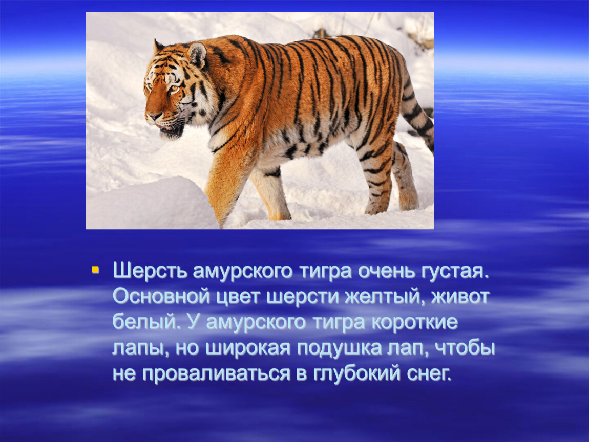 Шерсть амурского тигра очень густая. Основной цвет шерсти желтый, живот белый. У амурского тигра короткие лапы, но широкая подушка лап, чтобы не проваливаться в глубокий снег.