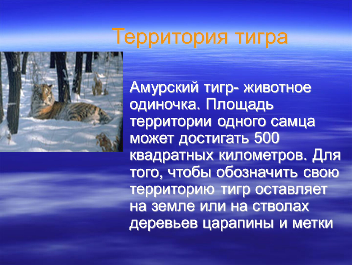 Амурский тигр- животное одиночка. Площадь территории одного самца может достигать 500 квадратных километров. Для того, чтобы обозначить свою территорию тигр оставляет на земле или на стволах деревьев царапины и метки