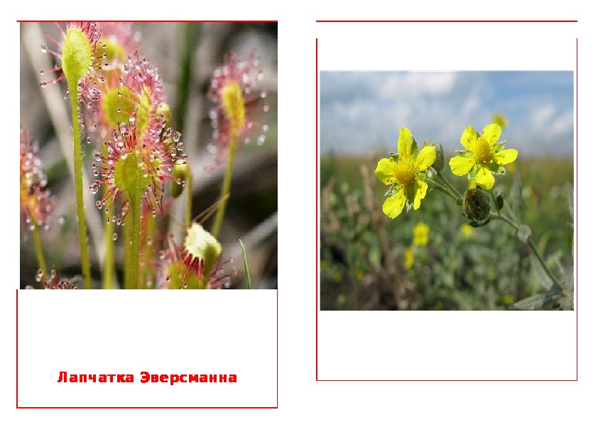 Адонис весеннийЖивокость УральскаяПрострел ЛуговойРосянка КруглолистнаяЛапчатка ЭверсманнаКопеечник Разумовского