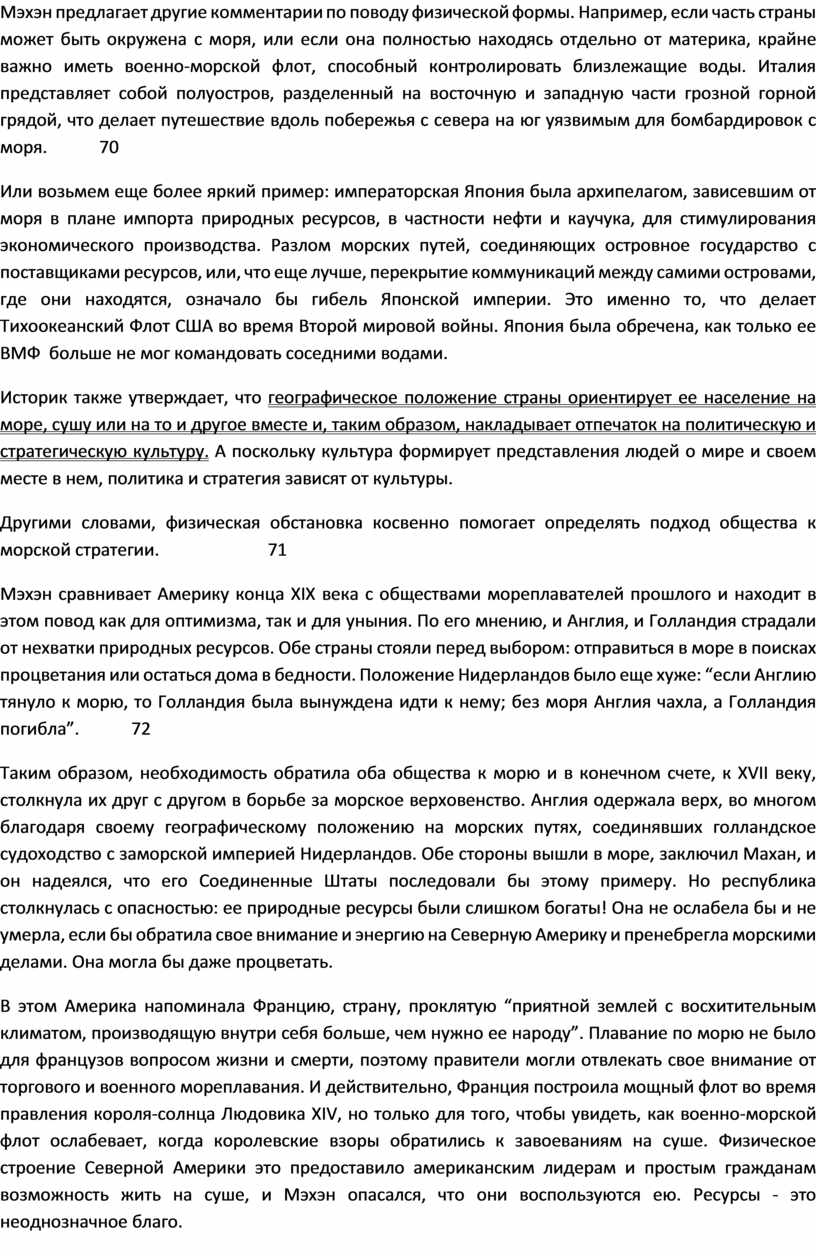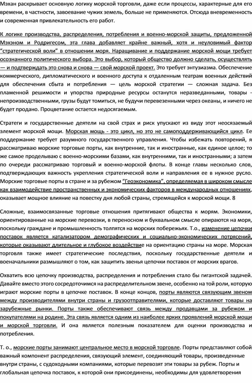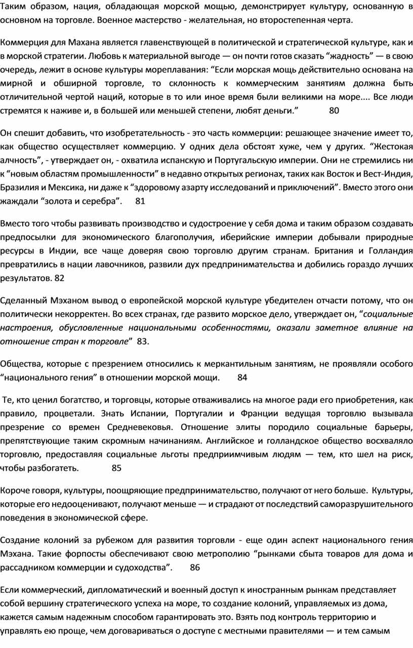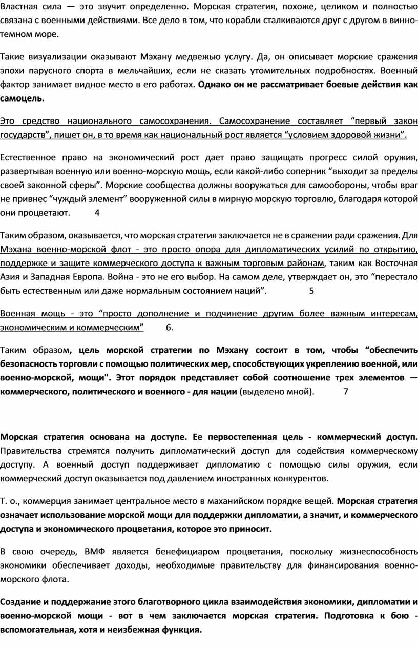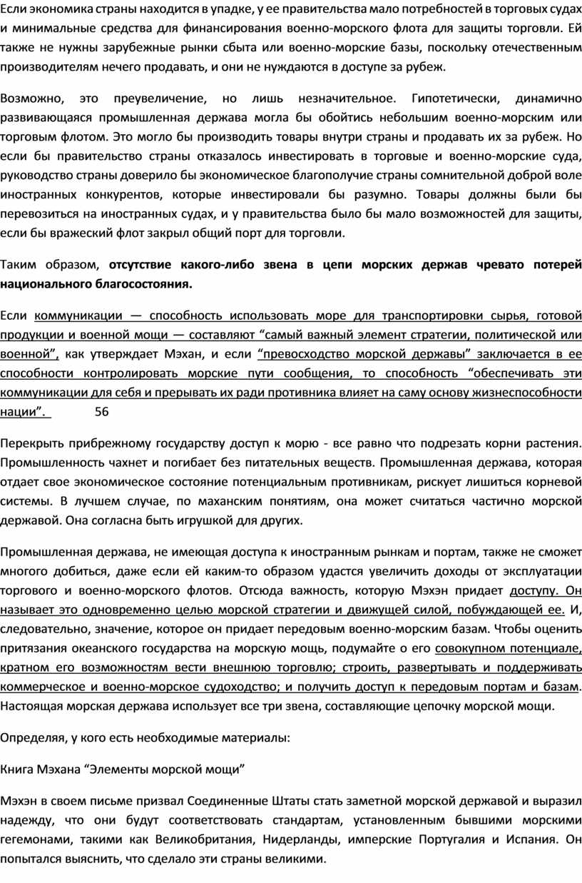 Таким образом, цель морской стратегии по Мэхану состоит в том, чтобы “обеспечить безопасность торговли с помощью политических мер, способствующих укреплению военной, или военно-морской, мощи". Этот порядок представляет собой соотношение трех элементов — коммерческого, политического и военного - для нации (выделено мной). 7
