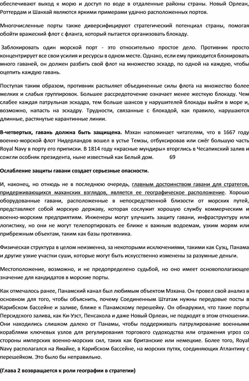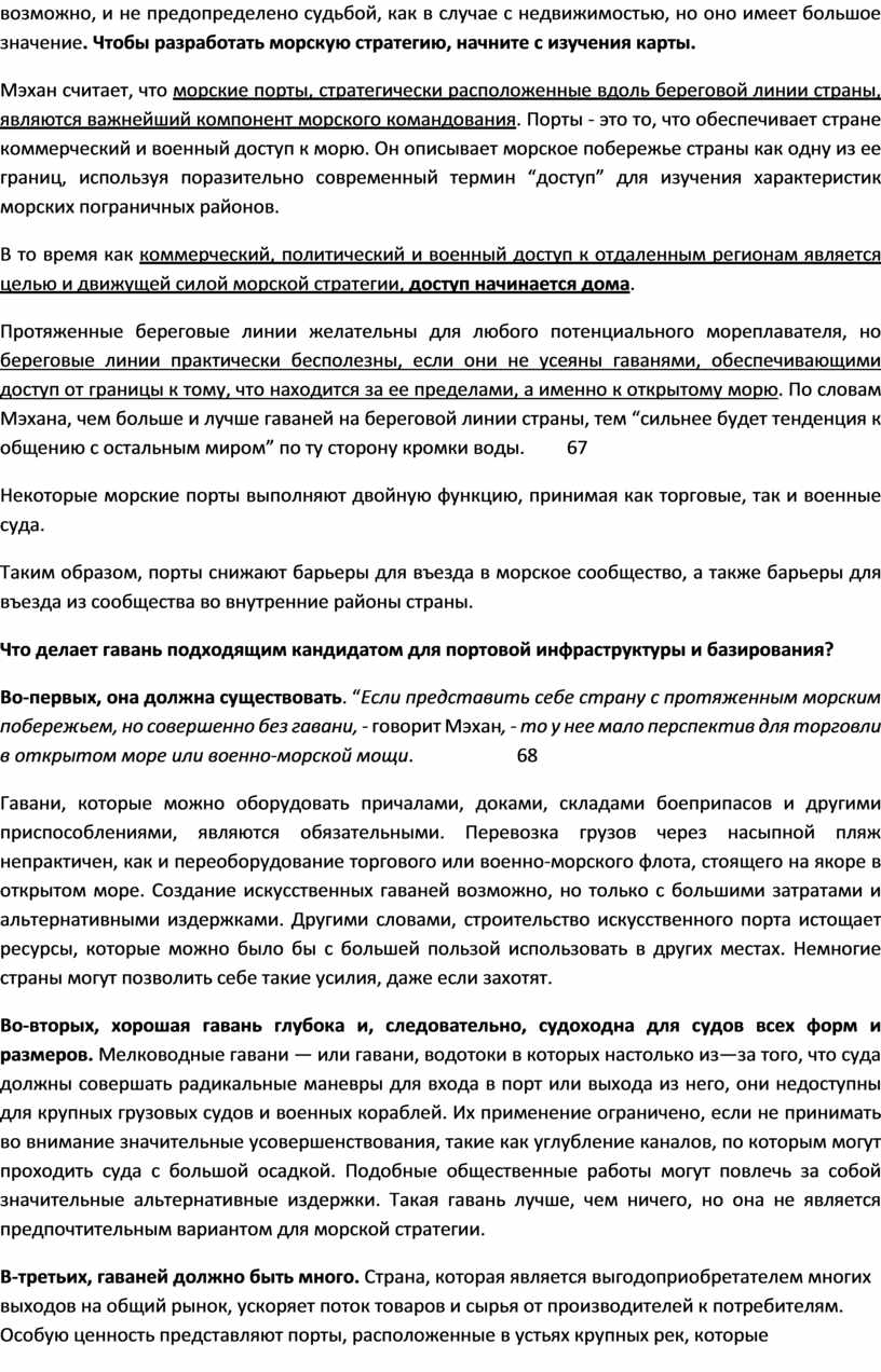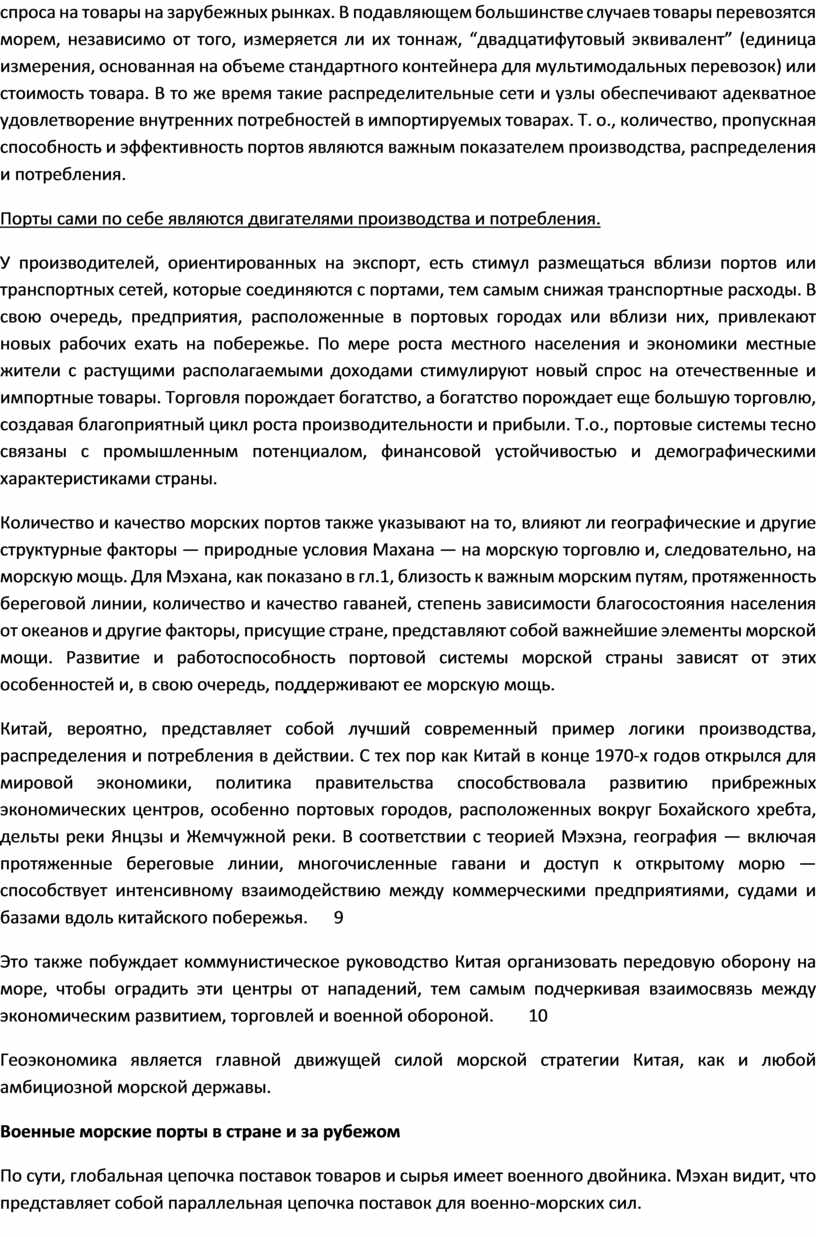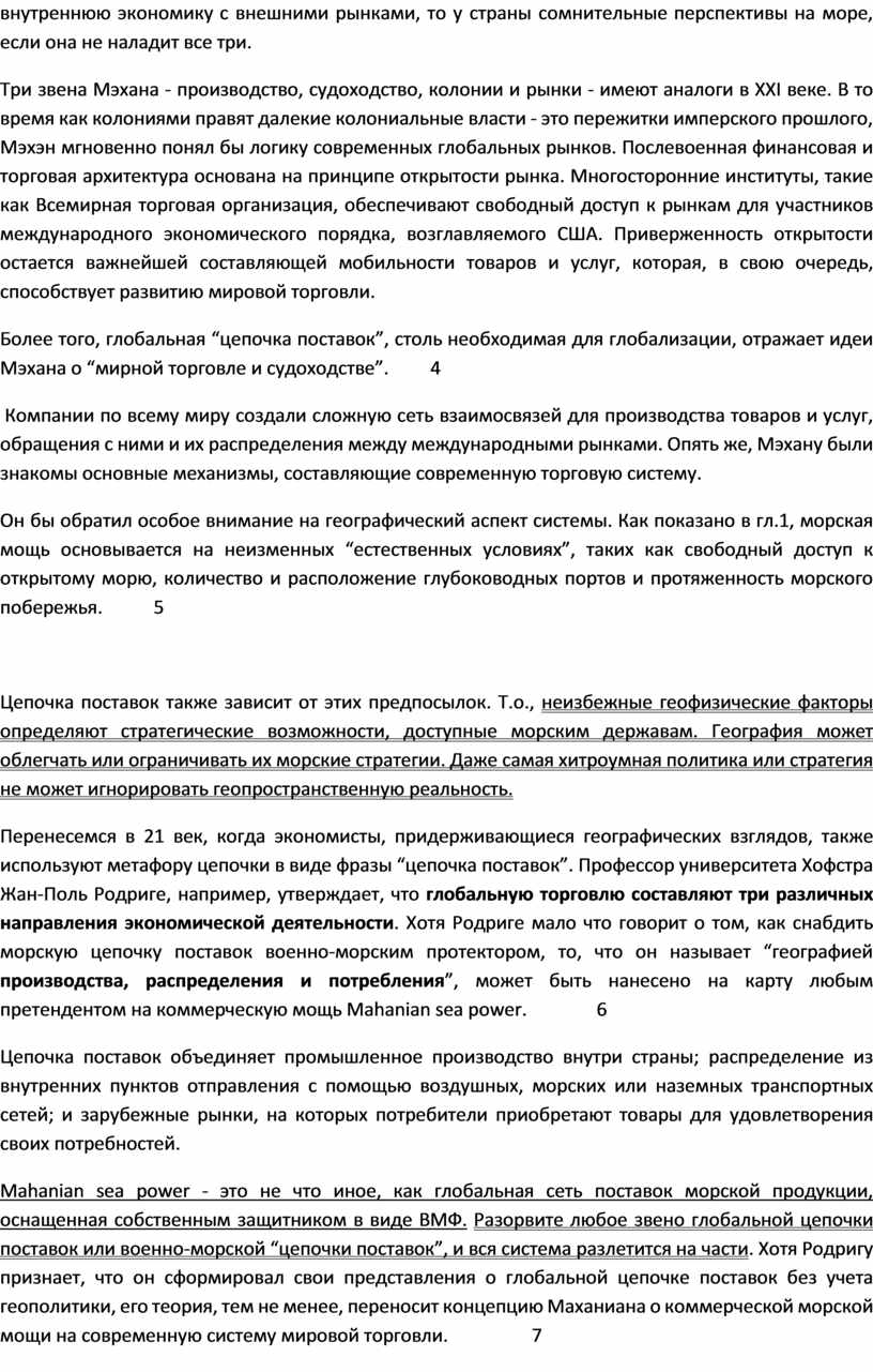 Таким образом, цель морской стратегии по Мэхану состоит в том, чтобы “обеспечить безопасность торговли с помощью политических мер, способствующих укреплению военной, или военно-морской, мощи". Этот порядок представляет собой соотношение трех элементов — коммерческого, политического и военного - для нации (выделено мной). 7